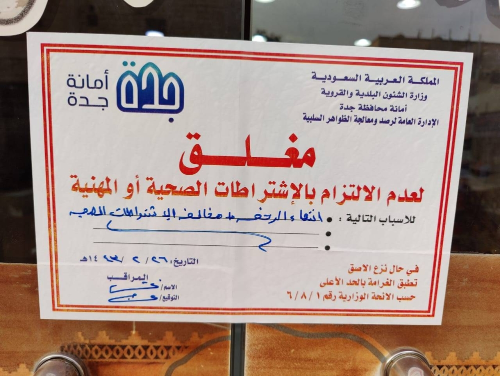 وفي حالة وجود القوارض أو حشرات داخل المنشأة توقع غرامة من 400 إلى 2000 ريال، وتغلق المنشأة حتى تتم المعالجة، وفي حالة ضبط عدم تنظيف الأجهزة والأدوات المستخدمة أو الأواني في الأنشطة المتعلقة بالصحة العامة «داخل المطاعم» توقع غرامة تتراوح بين 200 إلى 1000 ريال، وتتضاعف عند تكرار المخالفة، وعند ممارسة ذبح الحيوانات أو الطيور في مواقع غير مرخص لها توقع غرامة 400 إلى 2000 ريال، وتغلق المنشأة حتى تتم المعالجة.