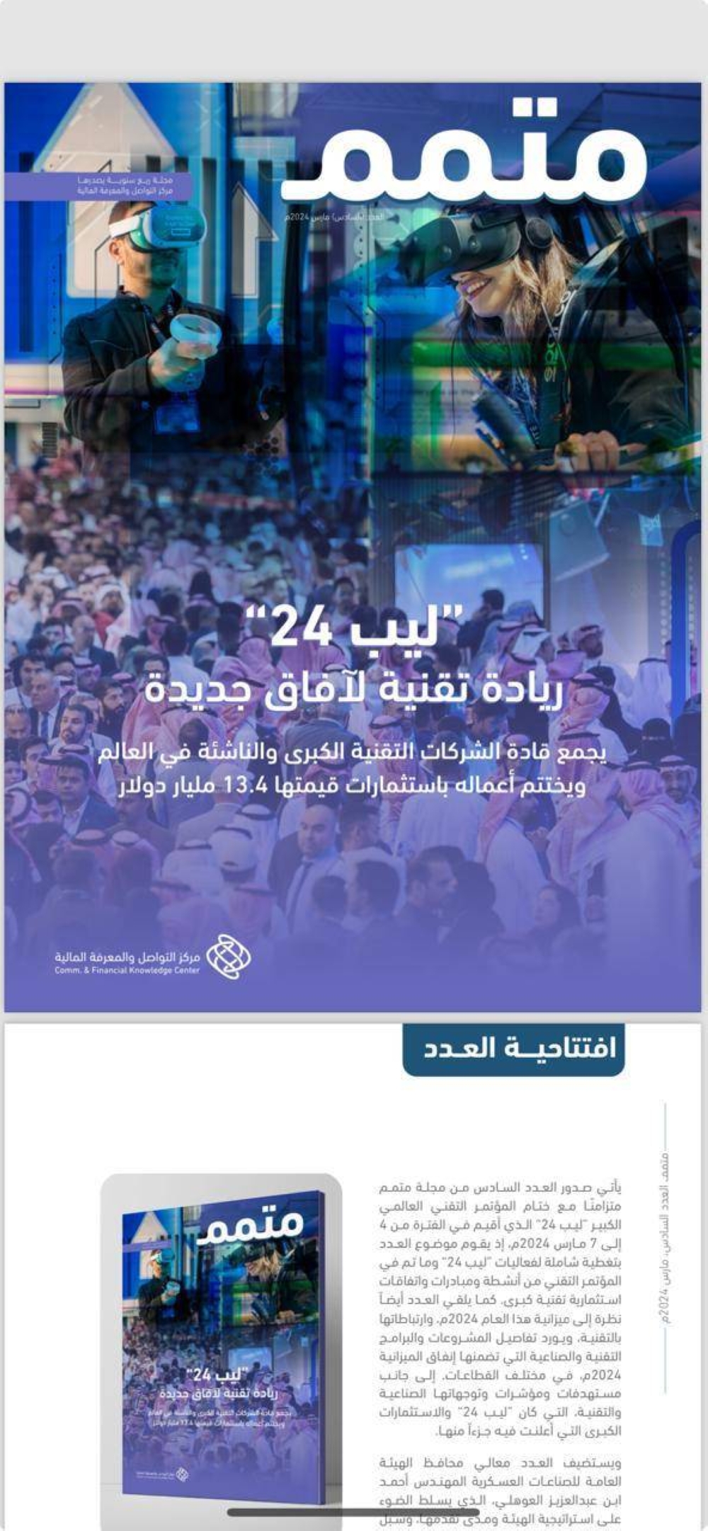 وركز العدد على الحدث التقني الدولي المهم "ليب 24" الذي أقيم بالرياض في الفترة من 4 إلى 7 مارس 2024، تحت عنوان "ليب 24 ريادة تقنية لآفاق جديدة"، حيث أفردت له ملفا خاصا شمل تغطيتها للفعاليات والمبادرات والإطلاقات الاستثمارية التقنية التي شهدها المؤتمر.