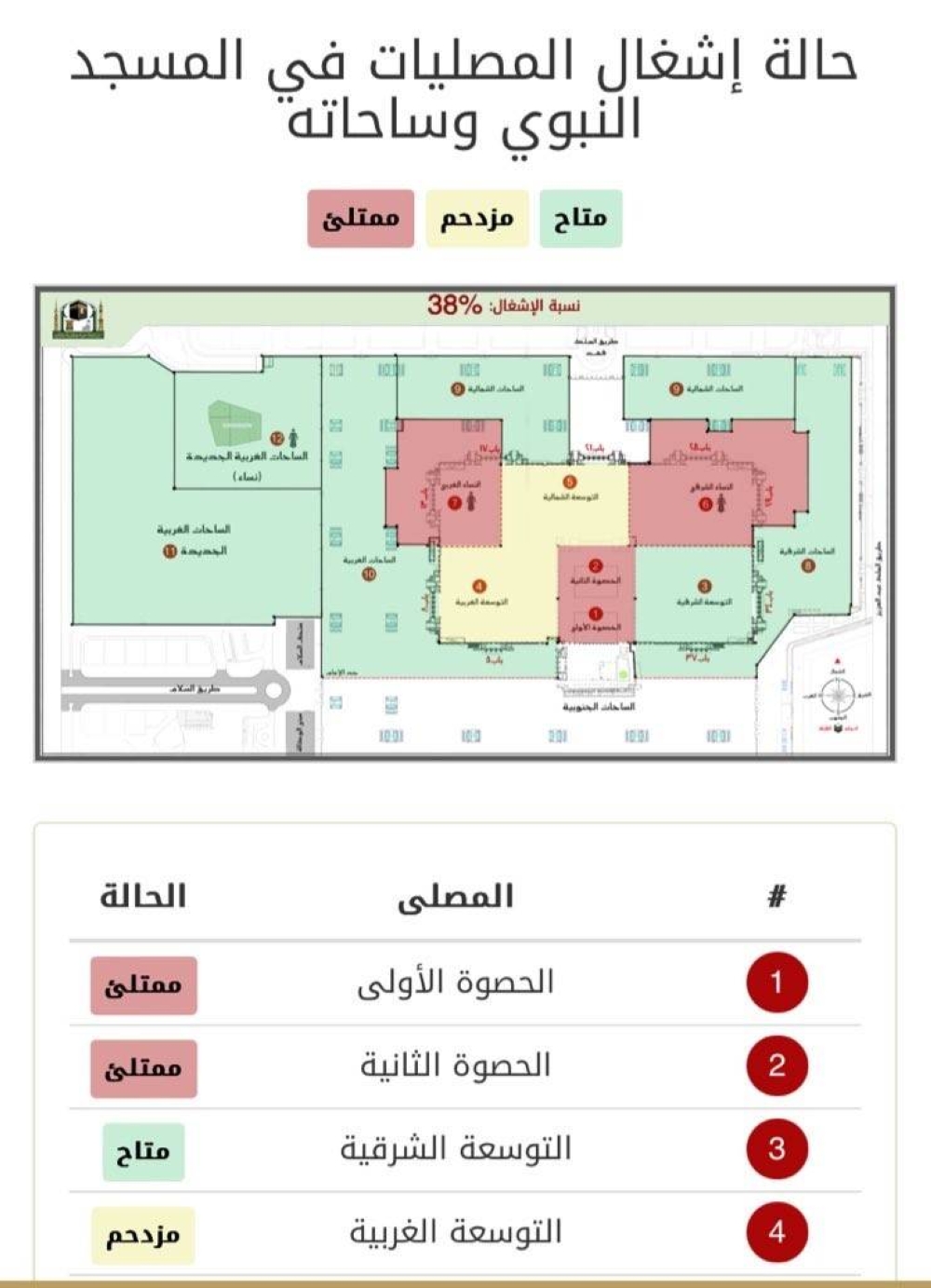 ويتم إشعار المصلين بالحالات من خلال إدارة الحشود والتي تقوم بالمتابعة للمواقع عبر الكاميرات والتواصل مع الأمن والأفراد على مدار الساعة لإشعار المستفيدين عن إشغال المصليات بالمصلين.