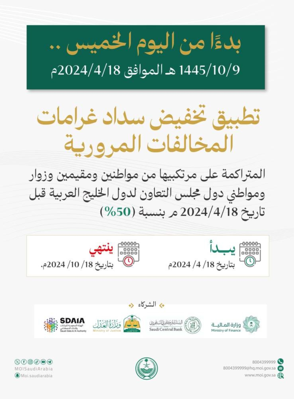 وأوضحت أن الاستفادة من التخفيض بإعفاء بنسبة (50%) من قيمة الغرامات، تقتضي مبادرة المخالف بسداد جميع المخالفات المرورية المتراكمة عليه خلال (6) أشهر تبدأ من تاريخ 18 / 4 / 2024م حتى 18 / 10 / 2024م.