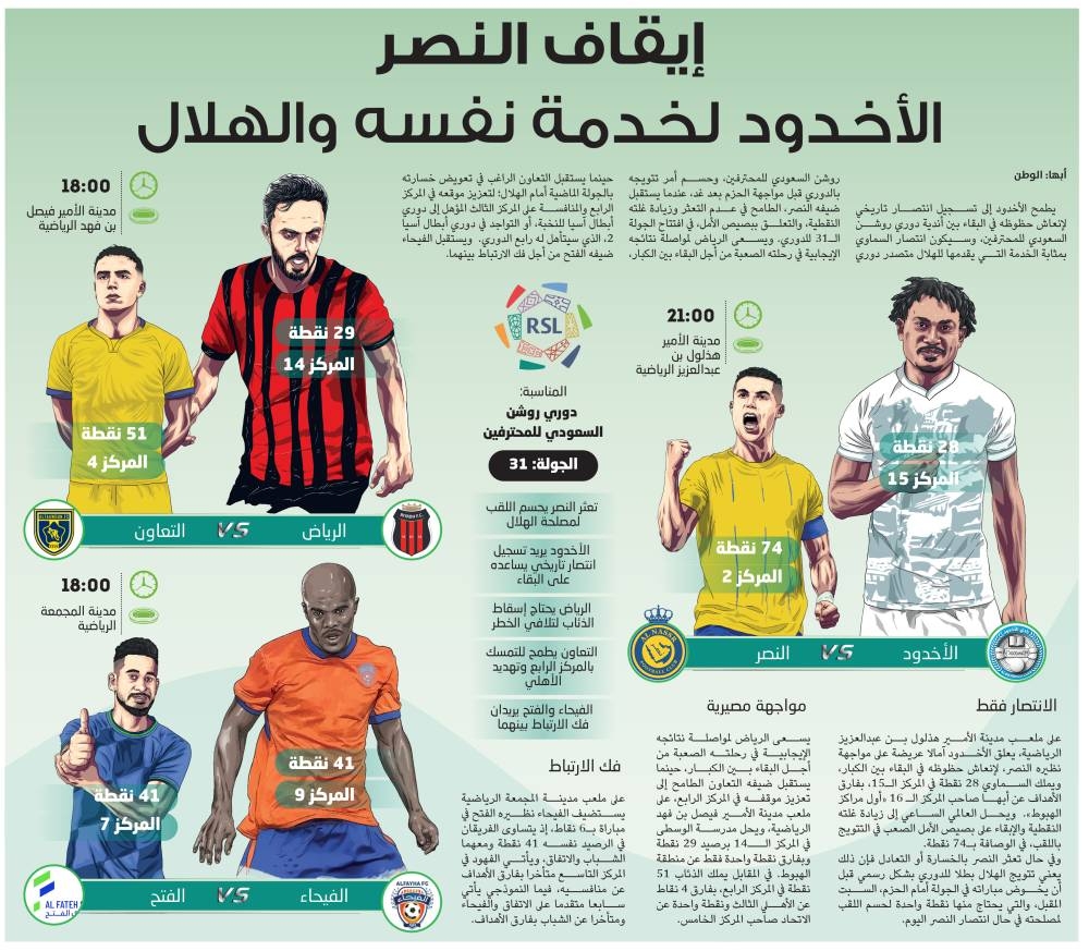 على ملعب مدينة الأمير هذلول بن عبدالعزيز الرياضية، يعلق الأخدود آمالا عريضة على مواجهة نظيره النصر، لإنعاش حظوظه في البقاء بين الكبار، ويملك السماوي 28 نقطة في المركز الـ15، بفارق الأهداف عن أبها صاحب المركز الـ 16 «أول مراكز الهبوط». ويحل العالمي الساعي إلى زيادة غلته النقطية والإبقاء على بصيص الأمل الصعب في التتويج باللقب، في الوصافة بـ74 نقطة.