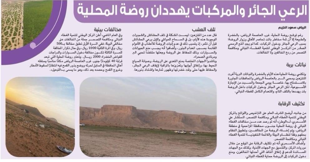 وأوضح المشرف العام على التراخيص واللوائح بالمركز الوطني لتنمية الغطاء النباتي ومكافحة التصحر، المستشار علي الأسمري في وقت سابق لـ«الوطن»، أنه تم رصد عدد من مخالفات الغطاء النباتي في الروضة، والذي تعرضت له الصحيفة تحت عنوان «الرعي الجائر والمركبات يهددان روضة المحلية» يوم الأحد الموافق 26 فبراير 2023.