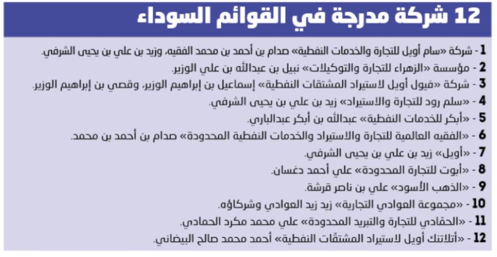 3 - شركة «فيول أويل لاستيراد المشتقات النفطية» إسماعيل بن إبراهيم الوزير، وقصي بن إبراهيم الوزير.