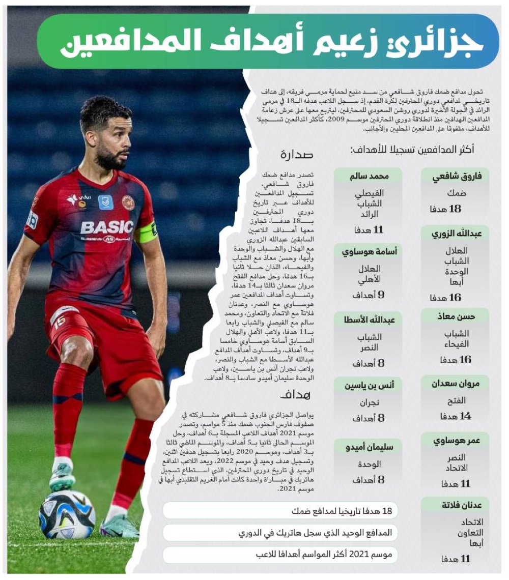 تصدر مدافع ضمك فاروق شافعي، تسجيل المدافعين للأهداف عبر تاريخ دوري المحترفين بـ18 هدفا، تجاوز معها أهداف اللاعبين السابقين عبدالله الزوري مع الهلال والشباب والوحدة وأبها، وحسن معاذ مع الشباب والفيحاء، اللذان حلا ثانيا بـ16 هدفا، وحل مدافع الفتح مروان سعدان ثالثا بـ14 هدفا، وتساوت أهداف المدافعين عمر هوساوي مع النصر، وعدنان فلاتة مع الاتحاد والتعاون، ومحمد سالم مع الفيصلي والشباب رابعا بـ11 هدفا، ولاعب الأهلي والهلال السابق أسامة هوساوي خامسا بـ9 أهداف، وتساوت أهداف المدافع عبدالله الأسطا مع الشباب والنصر، ولاعب نجران أنس بن ياسين، ولاعب الوحدة سليمان أميدو سادسا بـ8 أهداف.
