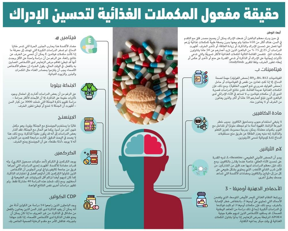 الفيتامينات B6، B12، وB9 (حمض الفوليك) مهمة لصحة الدماغ. إلا إذا كنتِ تعانين من نقص في الفيتامينات أو حامل (حمض الفوليك ضروري لمنع العيوب الخلقية)، ومع ذلك، فإن المكملات الغذائية عديمة الفائدة. تشير نتائج الدراسات قصيرة المدى إلى أن مكملات فيتامين ب لا تساعد في الأداء الإدراكي لدى البالغين الذين تبلغ أعمارهم 50 عامًا أو أكبر والذين يعانون من الخرف أو لا يعانون منه.