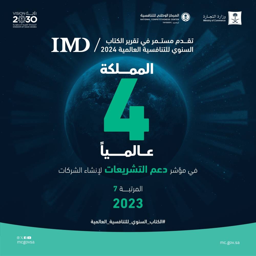 كما تقدمت المملكة إلى المرتبة الرابعة عالميًا في "مؤشر دعم الشركات لإنشاء الشركات" بعد أن كانت في المرتبة السابعة في تقرير الكتاب السنوي للتنافسية العام الماضي.