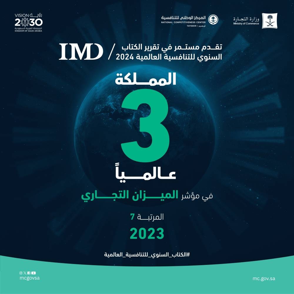 وتقدمت المملكة هذا العام إلى المرتبة (16) عالمياً من أصل (64) دولة هي الأكثر تنافسية في العالم، متقدمة مرتبة واحدة، مدعومة بتحسن تشريعات الأعمال من المرتبة (13) إلى المرتبة (12)، فيما حافظت على مرتبتها السابقة (34) في محور البنية التحتية، وبقيت في المراتب العشرين الأولى في الأداء الاقتصادي والكفاءة الحكومية، في تقرير الكتاب السنوي للتنافسية العالمية IMD لعام 2024م.