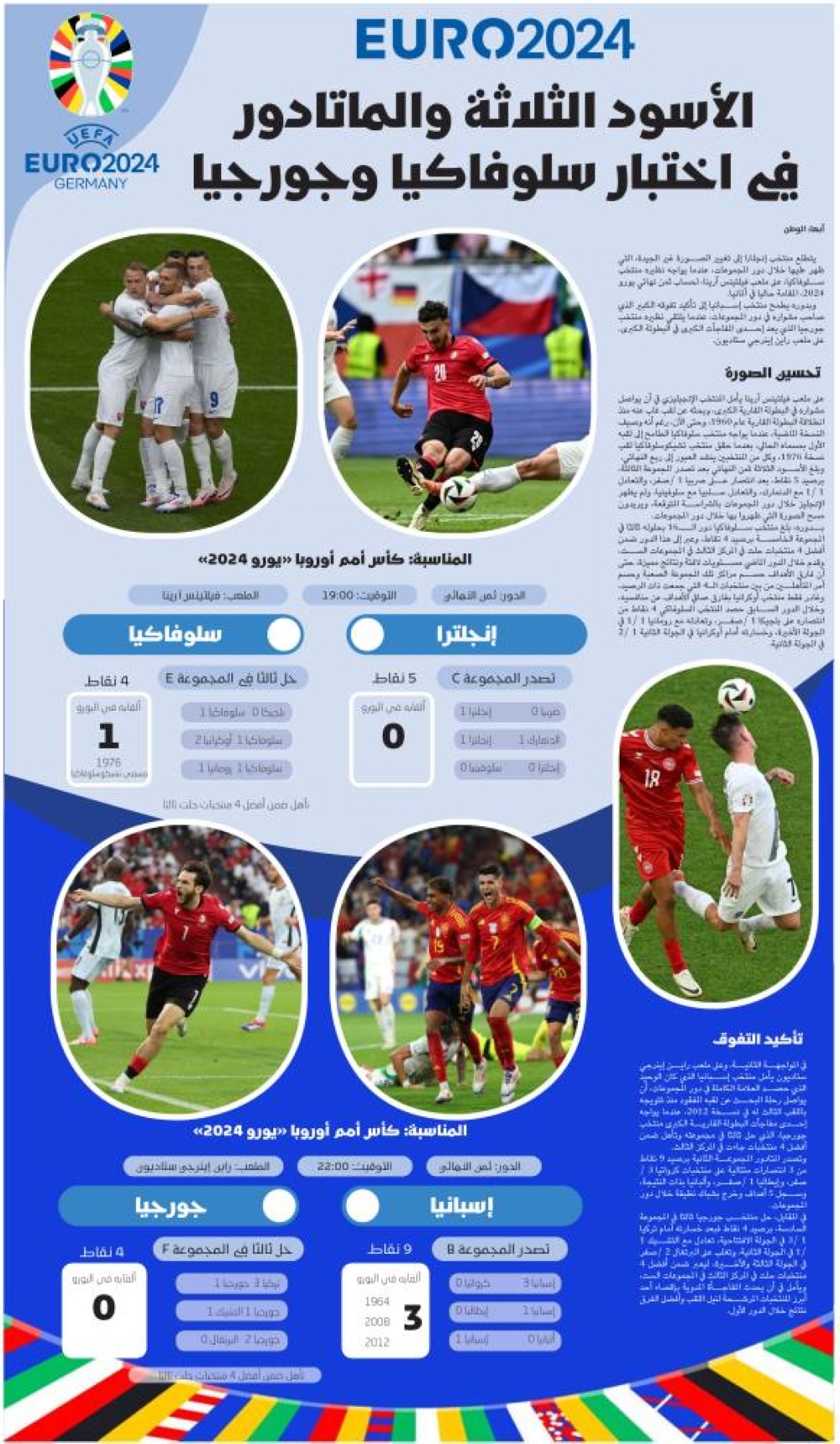 وبدوره يطمح منتخب إسبانيا إلى تأكيد تفوقه الكبير الذي صاحب مشواره في دور المجموعات، عندما يلتقي نظيره منتخب جورجيا الذي يعد إحدى المفاجآت الكبرى في البطولة الكبرى. على ملعب راين إينرجي ستاديون.