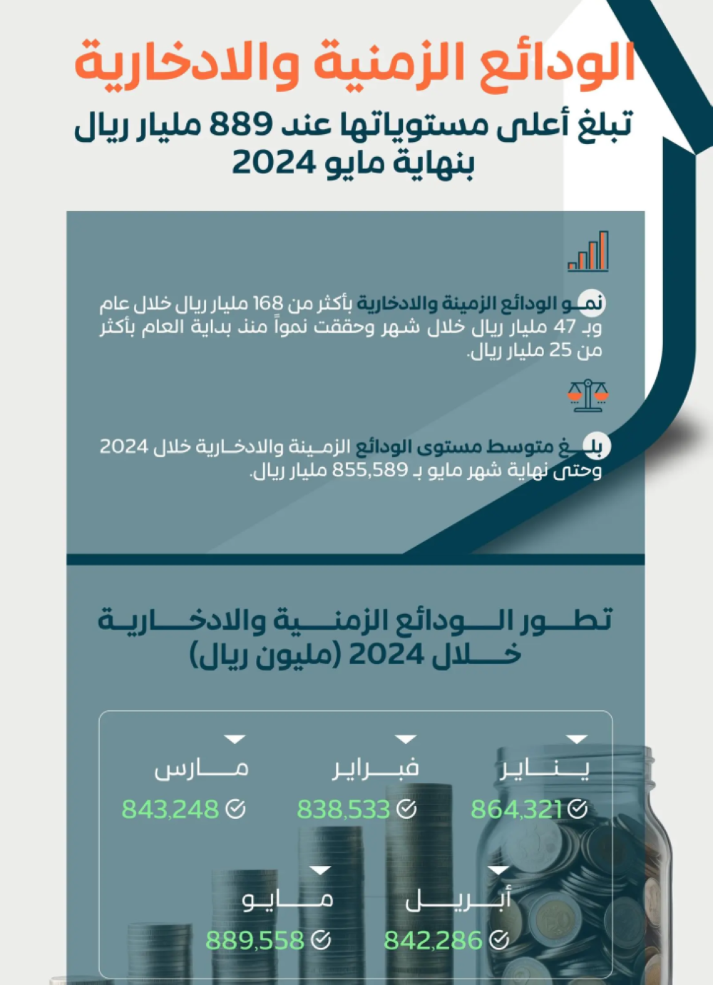 وحققت الودائع الزمنية والادخارية كذلك نموًّا شهريًّا بنسبة تُقدر بـ 5.6% بزيادة بلغت 47,273 مليار ريال، مقارنة بمستويات بلغت 842,286 مليار ريال بنهاية شهر أبريل من العام الجاري.