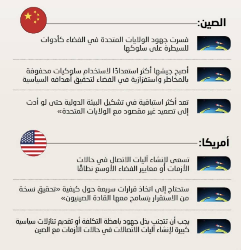 - أصبح جيشها أكثر استعدادًا لاستخدام سلوكيات محفوفة بالمخاطر واستفزازية في الفضاء لتحقيق أهدافه السياسية