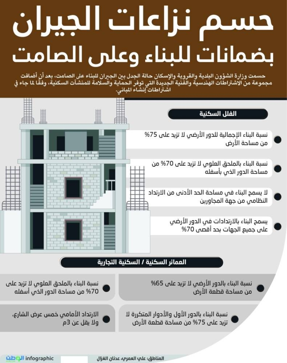 توجب الاشتراطات الجديدة أنه في حالة البناء على الصامت من جهة واحدة أو جهتين في كل الأدوار يجب فصل الهيكل الإنشائي بعمل جدار مزدوج بفاصل إنشائي عن المجاورين، ويجب الالتزام بتشطيب الجزء الظاهر للمجاورين عند البناء على الصامت بالمواد نفسها المستخدمة لديهم (في حالة الجار القائم يمكن استخدام مواد تشطيب أخرى شرط موافقة الأمانة أو البلدية عليها)، بالإضافة إلى ترك مسافة لا تقل عن 1.2 م حال فصله عن الدور الأرضي، ولا يزيد ارتفاع السقف للجزء الملاصق مع الجار على ارتفاع الدور الأرضي والسور 4.5 م كحد أقصى، وتلاصق أو دمج الملحق الخارجي بالدور الأرضي.