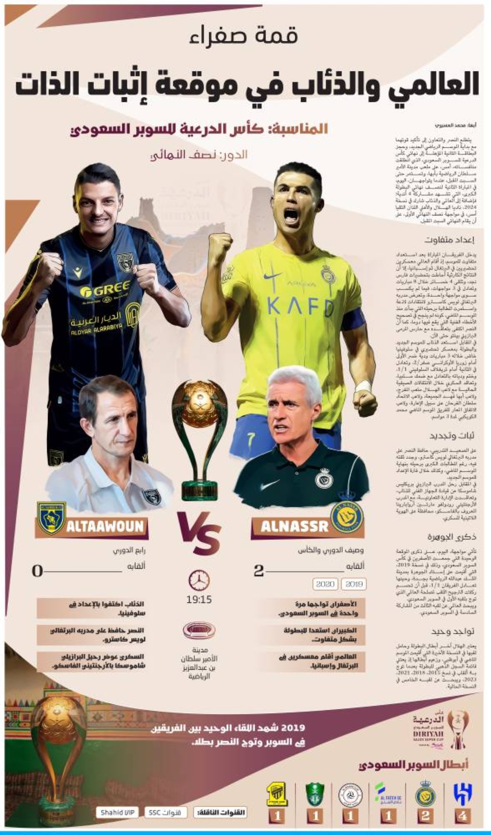 تأتي مواجهة، اليوم، على ذكرى الموقعة الوحيدة التي جمعت الأصفرين في كأس السوبر السعودي، وذلك في نسخة 2019، التي أقيمت على إستاد الجوهرة بمدينة الملك عبدالله الرياضية بجدة، وحينها تعادل الفريقان 1/1، قبل أن تحسم ركلات الترجيح اللقب لمصلحة العالمي الذي توج بلقبه الأول في السوبر السعودي.
