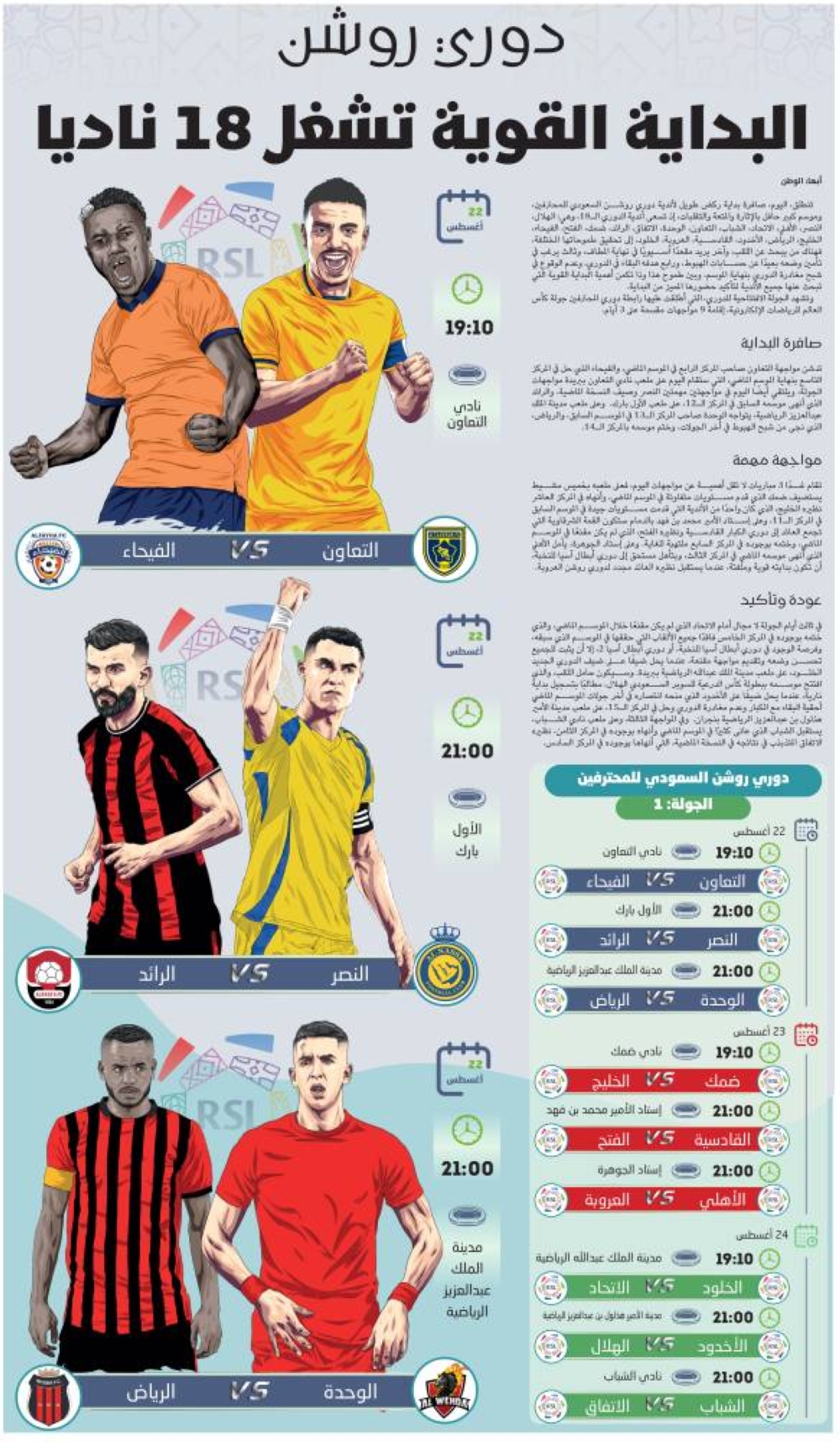 تدشن مواجهة التعاون صاحب المركز الرابع في الموسم الماضي، والفيحاء الذي حل في المركز التاسع بنهاية الموسم الماضي، التي ستقام اليوم على ملعب نادي التعاون ببريدة مواجهات الجولة، ويلتقي أيضًا اليوم في مواجهتين مهمتين النصر وصيف النسخة الماضية، والرائد الذي أنهى موسمه السابق في المركز الـ12، على ملعب الأول بارك. وعلى ملعب مدينة الملك عبدالعزيز الرياضية، يتواجه الوحدة صاحب المركز الـ13 في الموسم السابق، والرياض، الذي نجى من شبح الهبوط في أخر الجولات، وختم موسمه بالمركز الـ14.