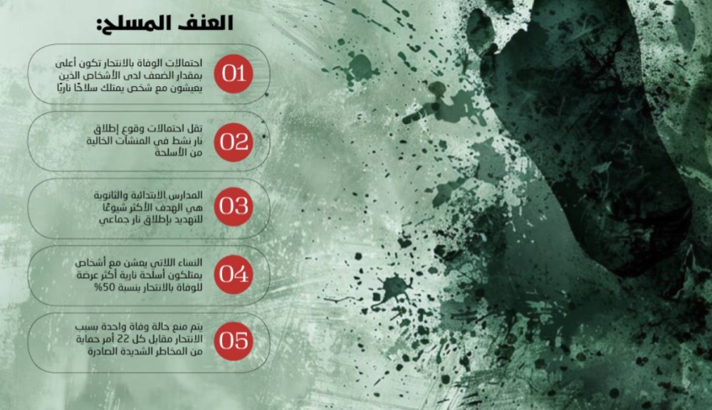 - النساء اللاتي يعشن مع أشخاص يمتلكون أسلحة نارية أكثر عرضة للوفاة بالانتحار بنسبة 50%