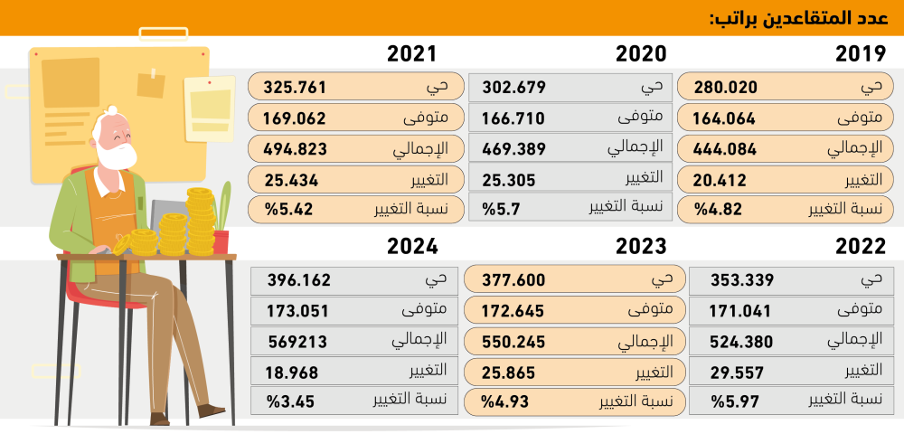 وأظهرت البيانات تسجيل المتقاعدين براتب زيادة سنوية مستمرة؛ حيث ارتفعت نسبتهم في 2019 بحوالي 4.82% منهم 280.020 حيا و164.064 متوفى، وبإجمالي 444.084 مشتركا بزيادة سنوية بلغت 20.412 مشتركا، ليرتفع في 2020 إلى 469.389 مشتركا بينهم 302.679 حيا و166.710 متوفين، وبزيادة سنوية 25.305 وبنمو 5.7%، وفي 2021 بلغ عدد المتقاعدين 494.823 بينهم 325.761 حيا، و169.062 متوفى، وبزيادة 25.434 وبنسبة تغيير 5.42%، وفي 2022 ارتفع عدد المتقاعدين ليصل إلى 524.380 بينهم 353.339 حيا و171.041 متوفى، وبزيادة بلغت 29.557 مشتركا بنمو 5.97%، وفي 2023 بلغ عدد المتقاعدين 550.245 بينهم 377.600 حي، و172.645 متوفى وبزيادة 25.865 مشتركا وبنسبة 4.93%، لتصل في 2024 لأعلى عدد، ويصل عدد المتقاعدين 569.213 متقاعدا مسجلين بين حي ومتوفى.
