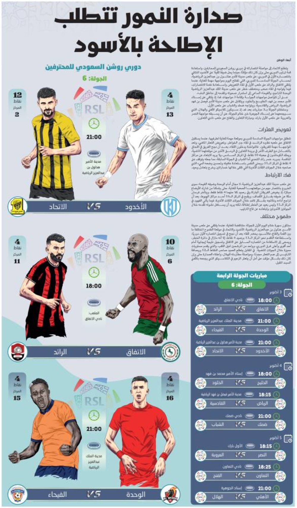 يتطلع الاتحاد إلى مواصلة انتصاراته في دوري روشن السعودي للمحترفين، واستعادة قمة ترتيب الدوري حتى وإن كان ذلك مؤقتًا، حينما يحل ضيفًا ثقيلًا على الأخدود المنتشي بانتصاره الأول في الدوري، على ملعب مدينة الأمير هذلول بن عبدالعزيز الرياضية، لحساب الجولة السادسة للدوري، التي تفتتح اليوم بمواجهة مهمة للغاية، عندما يلتقي الاتفاق والرائد على ملعب الأول في لقاء التعويض واستعادة نغمة الانتصارات، فيما يتواجه في لقاء صعب ومنعطف خطر على ملعب مدينة الملك عبدالعزيز الرياضية الوحدة المتراجع، والفيحاء الساعي إلى استمرار صحوته وتقدمه إلى مناطق الدفء.