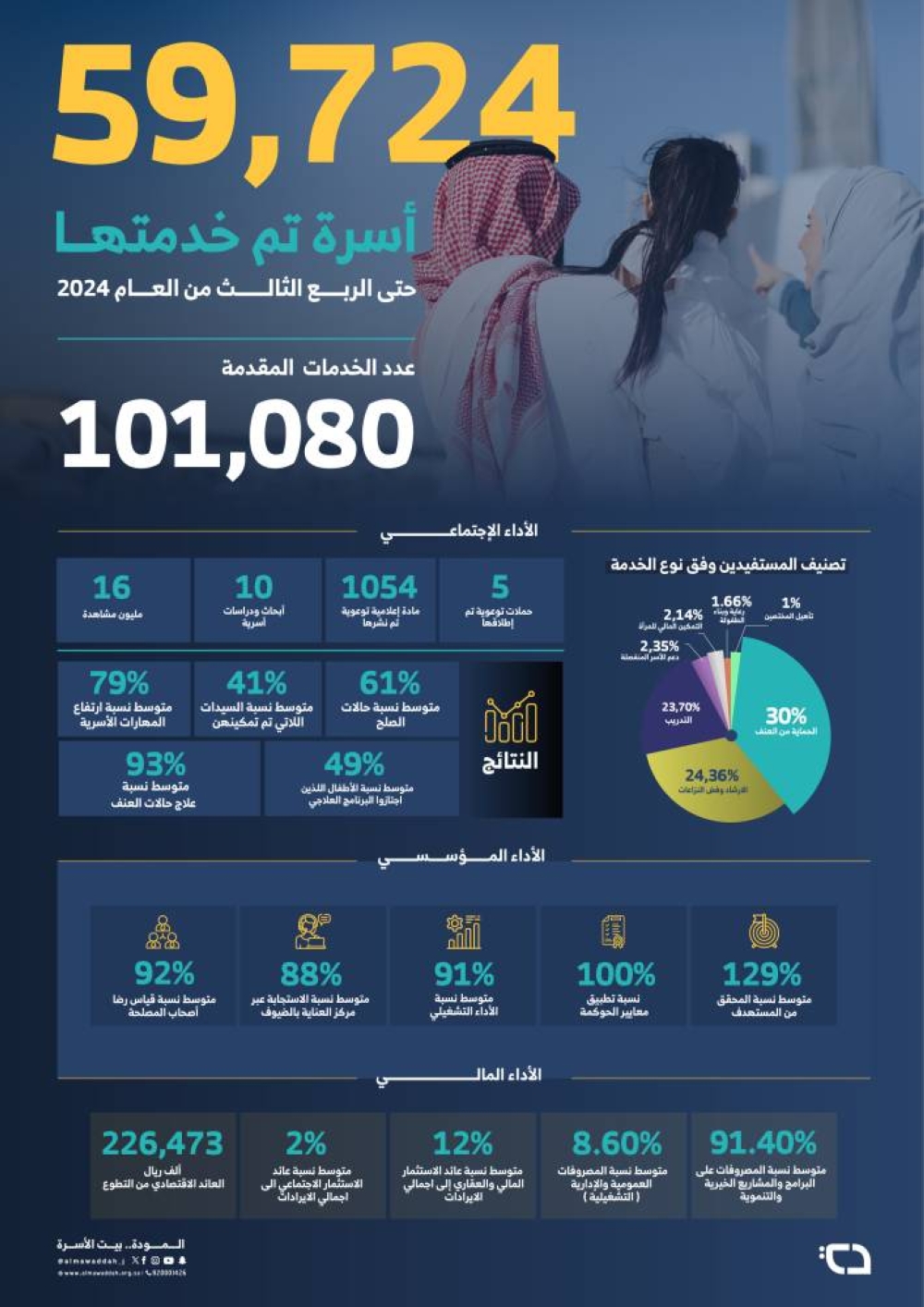 وأوضح المدير العام للمودة محمد بن علي آل رضي، أن جمعية المودة مستمرة في تحقيق صناعة أثر أعمق في حياة الأسر؛ حيث بلغت نسبة ارتفاع المهارات لدى الأسر المستفيدة من منصة العائلة 79% من خلال الدورات المقدمة. إضافة إلى اجتياز 49% من الأطفال البرنامج العلاجي من الاضطرابات النمائية والسلوكية عبر مركز الطفل المبتكر. ومن خلال مبادرات حماية الأسرة تم معالجة 93% من حالات العنف الواردة لمراكز الحماية، وبلغت حالات الصلح وفض النزاعات بين الأسر 61% وبلغ متوسط نسبة التمكين المالي للسيدات 41% من خلال مركز مُكرمة لتمكين المرأة.