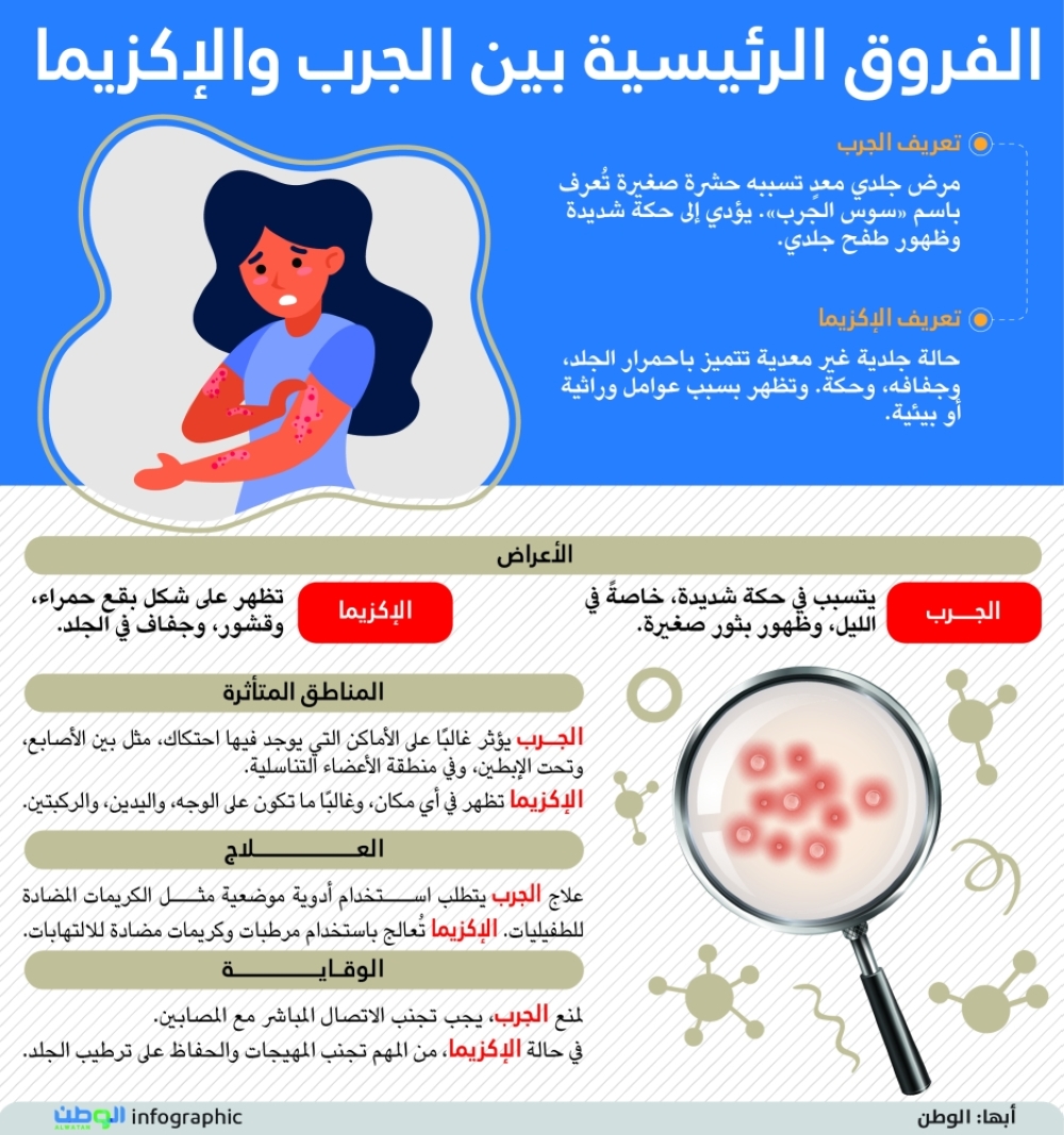 مرض جلدي معدٍ تسببه حشرة صغيرة تُعرف باسم «سوس الجرب». يؤدي إلى حكة شديدة وظهور طفح جلدي.