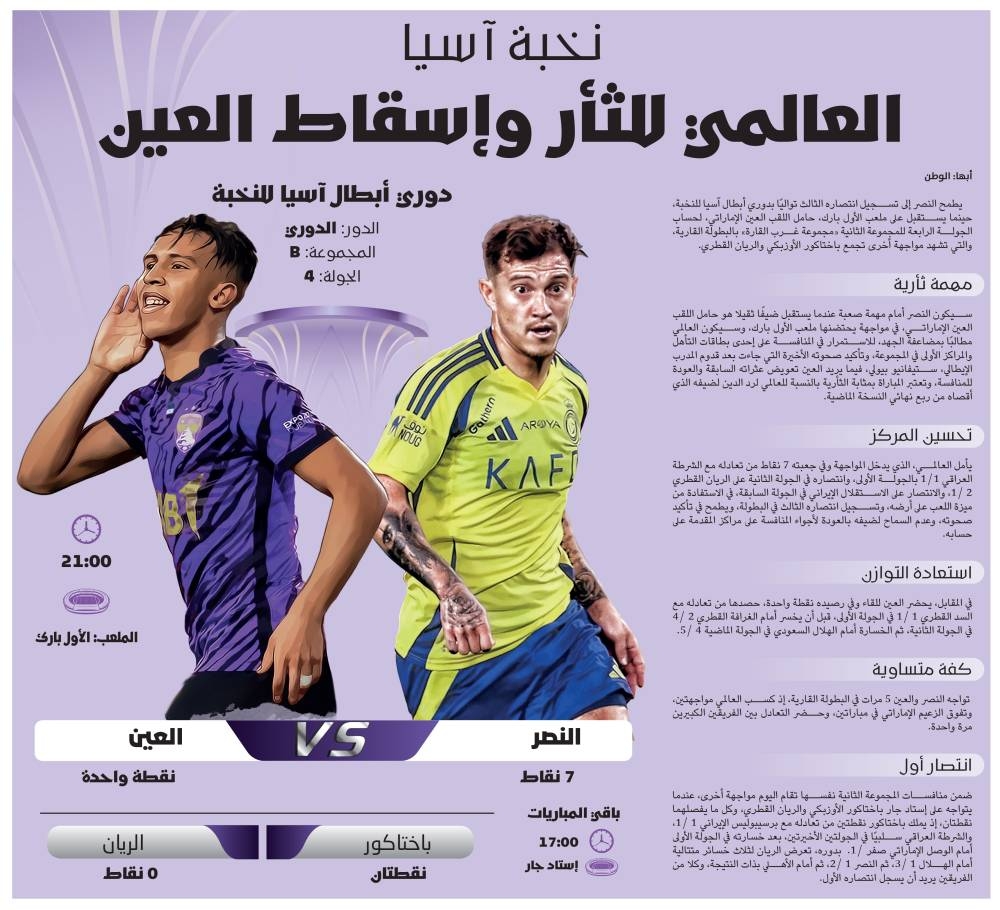 سيكون النصر أمام مهمة صعبة عندما يستقبل ضيفًا ثقيلا هو حامل اللقب العين الإماراتي، في مواجهة يحتضنها ملعب الأول بارك، وسيكون العالمي مطالبًا بمضاعفة الجهد، للاستمرار في المنافسة على إحدى بطاقات التأهل والمراكز الأولى في المجموعة، وتأكيد صحوته الأخيرة التي جاءت بعد قدوم المدرب الإيطالي، ستيفانيو بيولي، فيما يريد العين تعويض عثراته السابقة والعودة للمنافسة، وتعتبر المباراة بمثابة الثأرية بالنسبة للعالمي لرد الدين لضيفه الذي أقصاه من ربع نهائي النسخة الماضية.