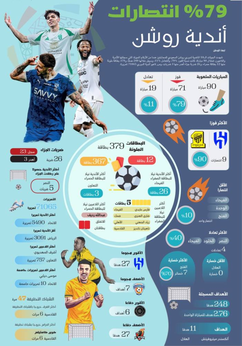 شهدت الجولات الـ10 الماضية لدوري روشن السعودي للمحترفين عددا من الأرقام المميزة، التي سجلتها الأندية واللاعبون، فخلال 90 مباراة، كانت نسبة الفوز 79%، والتعادل 11%، وسجل خلالها 248 هدفا، و379 بطاقة ملونة منها 12 بطاقة حمراء، و26 ضربة جزاء أهدر منها 3 ضربات، ومرر لاعبو أندية الدوري 71065 تمريرة.