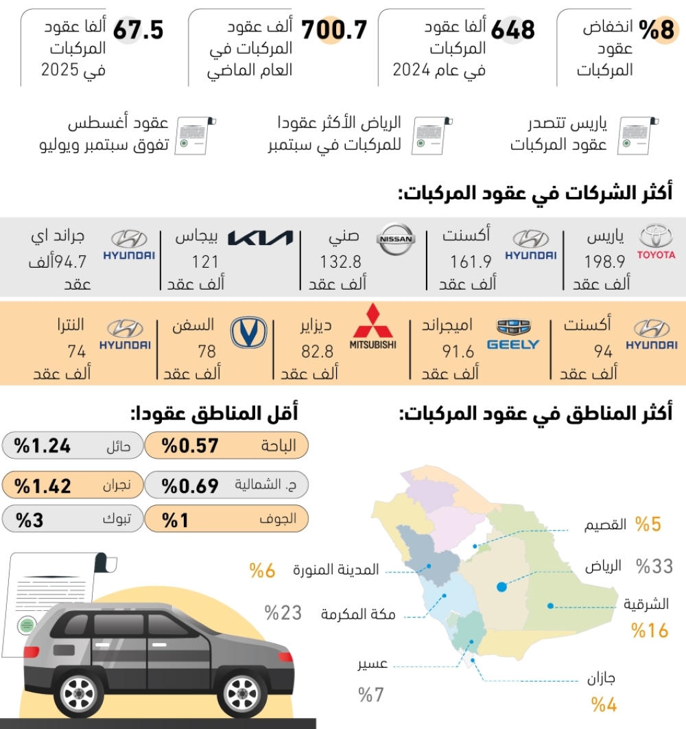 وسيطرت تويوتا ياريس على عقود المركبات حسب شركة المركبة والطراز بـ198.958 ألف عقد خلال الربع الثالث من العام الحالي، في وقت بلغت العقود حسب صنع المركبة لعام 2025 المقبل 67.586 ألف عقد إلى الآن.