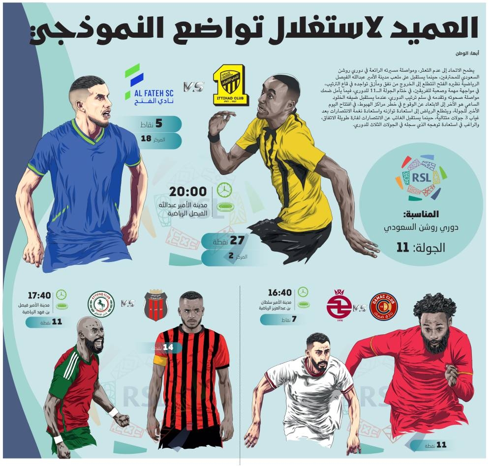 يطمح الاتحاد إلى عدم التعثر، ومواصلة مسيرته الرائعة في دوري روشن السعودي للمحترفين، حينما يستقبل على ملعب مدينة الأمير عبدالله الفيصل الرياضية نظيره الفتح المتطلع إلى الخروج من نفق ومأزق تواجده في قاع الترتيب، في مواجهة مهمة وصعبة للفريقين، في ختام الجولة الـ11 للدوري، فيما يأمل ضمك مواصلة صحوته وتقدمه في سلم ترتيب الدوري، عندما يستقبل ضيفه الخلود الساعي هو الآخر إلى الابتعاد عن الوقوع في خطر مراكز الهبوط، في افتتاح اليوم الأخير للجولة، ويتطلع الرياض إلى استعادة توازنه واستعادة نغمة الانتصارات بعد غياب 3 جولات متتالية، حينما يستقبل الغائب عن الانتصارات لفترة طويلة الاتفاق، والراغب في استعادة توهجه الذي سجله في الجولات الثلاث للدوري.