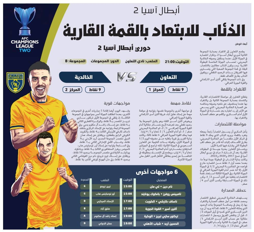 يتطلع التعاون إلى مواصلة الانتصارات القارية، والتمسك بصدارة المجموعة الثانية بل والانفراد بها عندما يستضيف على ملعبه وصيفه ومنافسه على الصدارة الخالدية البحريني، الذي يسعى هو الآخر إلى رد اعتباره بعد خسارته في الجولة الأولى أمام السكري، والأهم هو خطف الصدارة والانفراد بها.