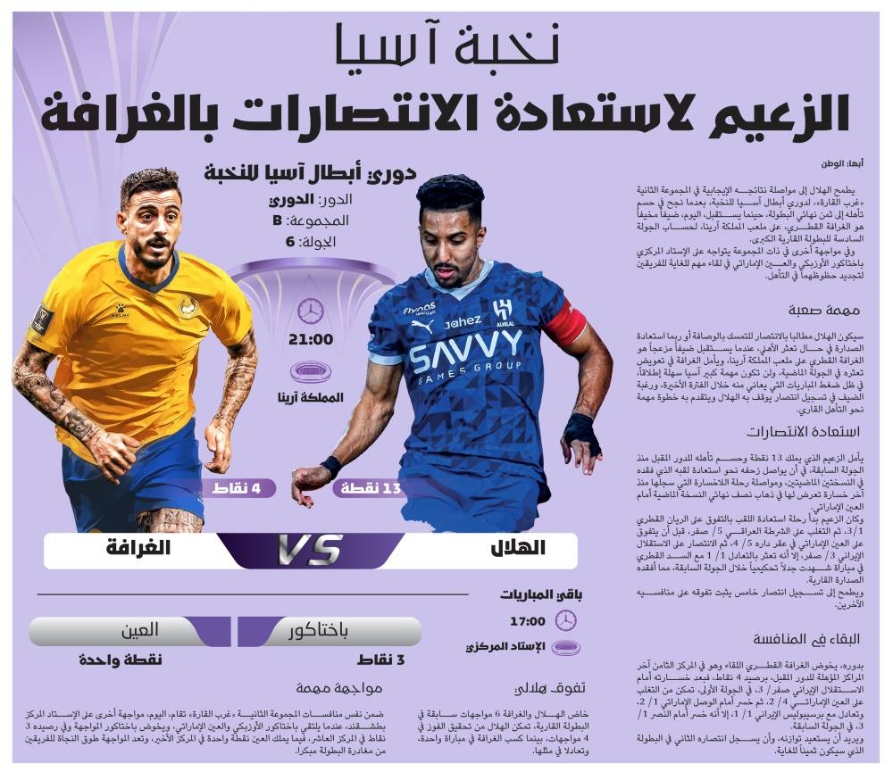 سيكون الهلال مطالبا بالانتصار للتمسك بالوصافة أو ربما استعادة الصدارة في حال تعثر الأهلي، عندما يستقبل ضيفاً مزعجاً هو الغرافة القطري على ملعب المملكة آرينا، ويأمل الغرافة في تعويض تعثره في الجولة الماضية، ولن تكون مهمة كبير آسيا سهلة إطلاقاً، في ظل ضغط المباريات التي يعاني منه خلال الفترة الأخيرة، ورغبة الضيف في تسجيل انتصار يوقف به الهلال ويتقدم به خطوة مهمة نحو التأهل القاري.