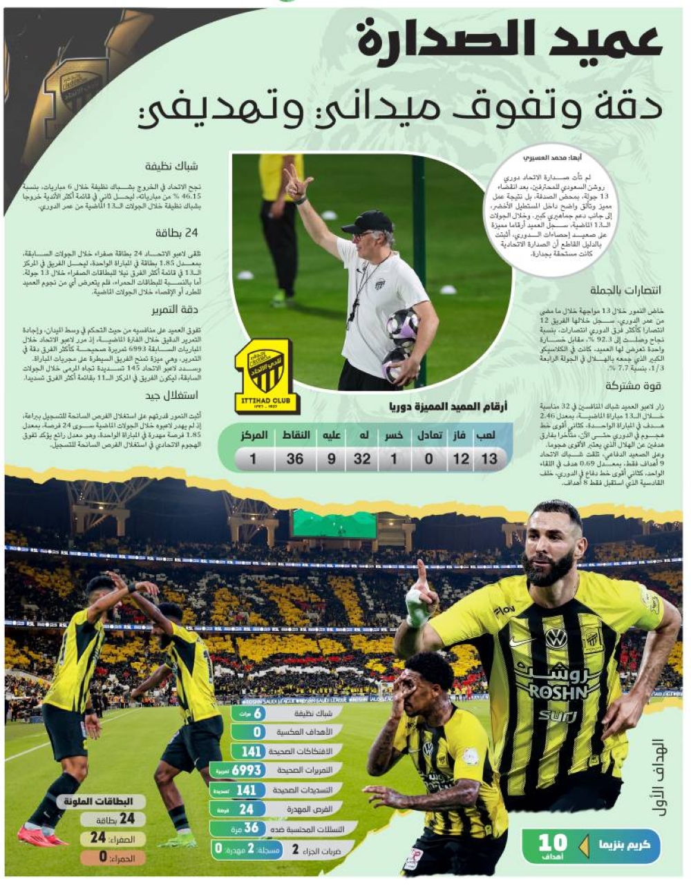 خاض النمور خلال 13 مواجهة خلال ما مضى من عمر الدوري، سجل خلالها الفريق 12 انتصارا كأكثر فرق الدوري انتصارات، بنسبة نجاح وصلت إلى 92.3 %، مقابل خسارة واحدة تعرض لها العميد، كانت في الكلاسيكو الكبير الذي جمعه بالهلال في الجولة الرابعة 3/1، بنسبة 7.7 %.
