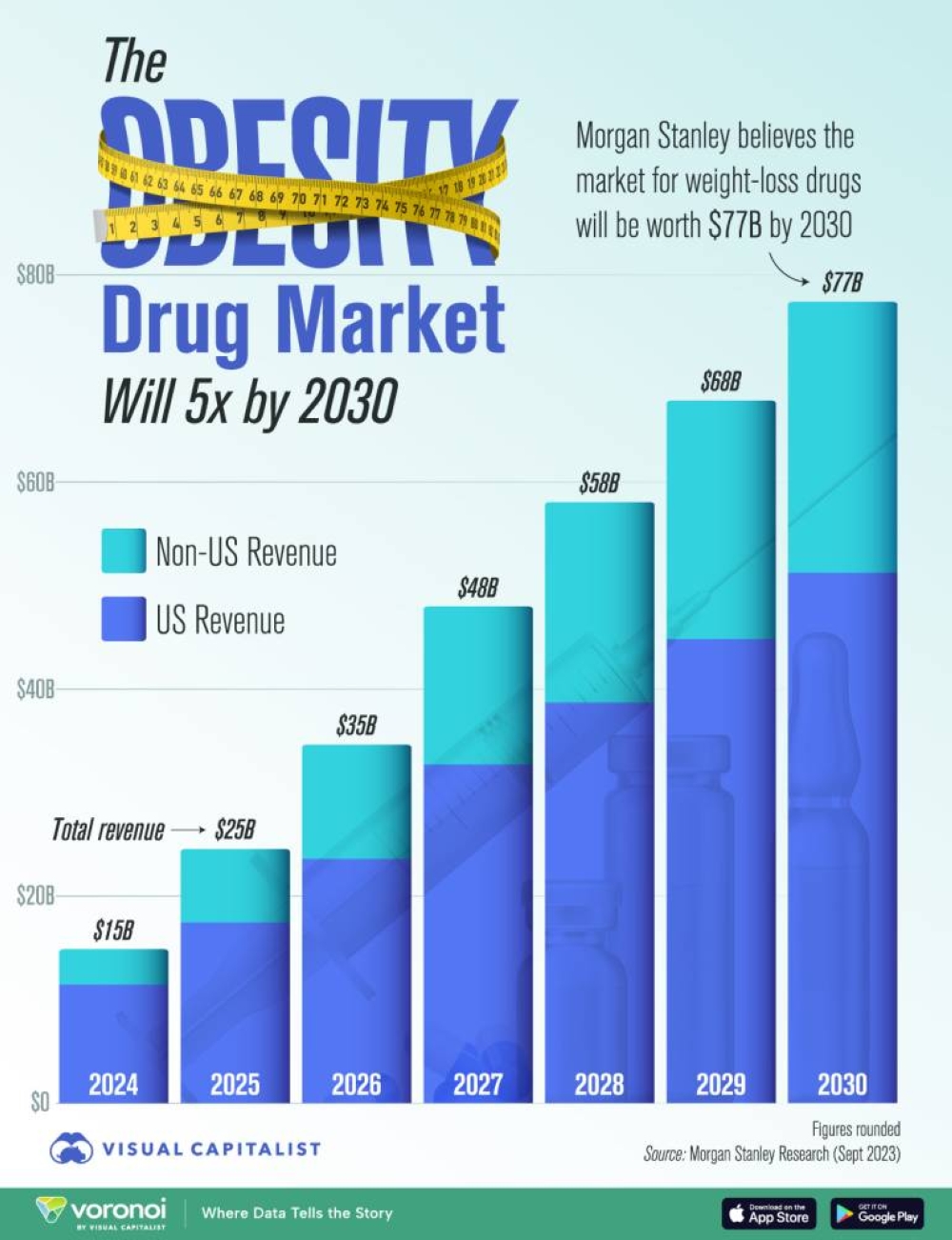 ويتوقع أن تنخفض حصة الولايات المتحدة من السوق العالمي لتصل إلى 66 % بحلول 2030، بينما تشير منظمة الصحة العالمية إلى أن السمنة تسبب 5 % من الوفيات عالميًا، مما يعزز الحاجة إلى حلول فعالة.