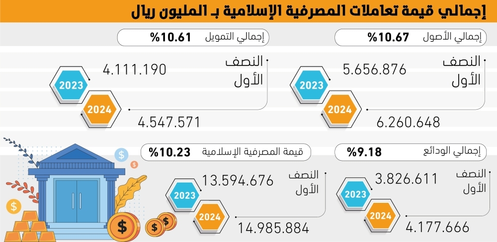 وبلغ إجمالي الأصول في المصرفية الإسلامية 6.2 تريليونات ريال مرتفعة من 5.6 تريليونات ريال مرتفعة بنسبة 10.6% خلال عام، حيث تُعد المصرفية الإسلامية واحدة من أسرع القطاعات نموًا في الصناعة المالية عالميًا، وتعتبر المملكة من أبرز الدول التي تقود هذا النمو، ويشير إجمالي أصول المصرفية الإسلامية إلى القيمة الإجمالية لجميع الأصول التي تُدار وفق أحكام الشريعة الإسلامية، وتشمل هذه الأصول، الودائع الإسلامية، والتسهيلات التمويلية المتوافقة مع الشريعة، والصكوك الإسلامية، والاستثمارات في المشروعات المتوافقة مع الشريعة.