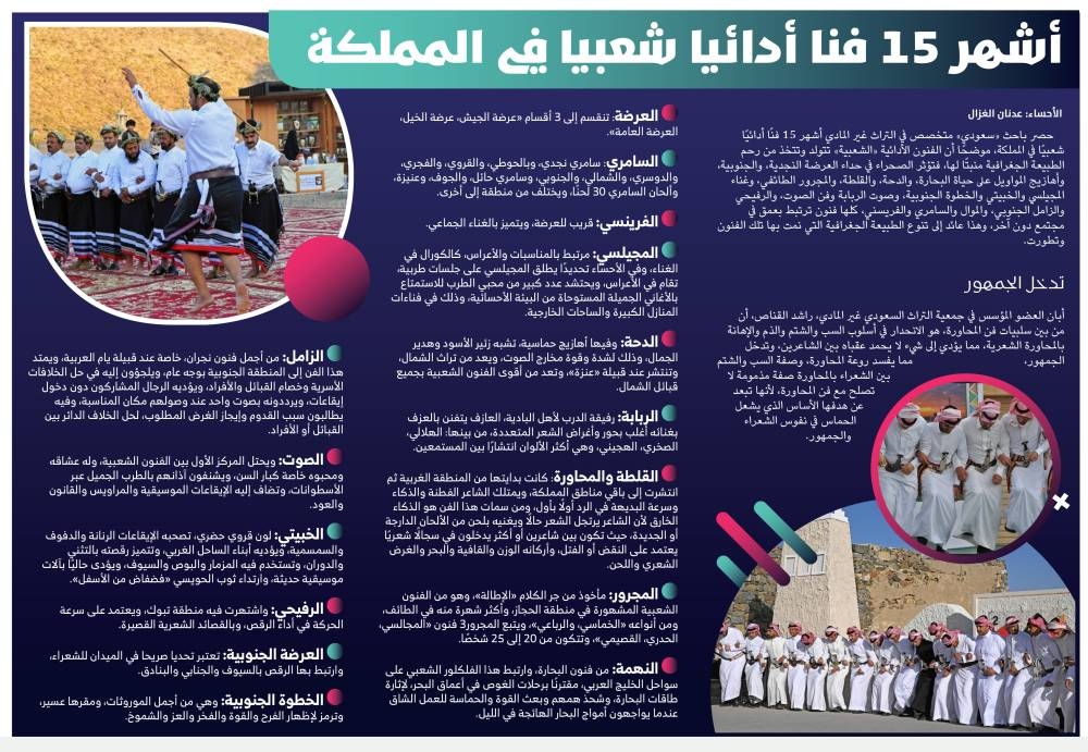 الصوت: ويحتل المركز الأول بين الفنون الشعبية، وله عشاقه ومحبوه خاصة كبار السن، ويشنفون آذانهم بالطرب الجميل عبر الأسطوانات، وتضاف إليه الإيقاعات الموسيقية والمراويس والقانون والعود.