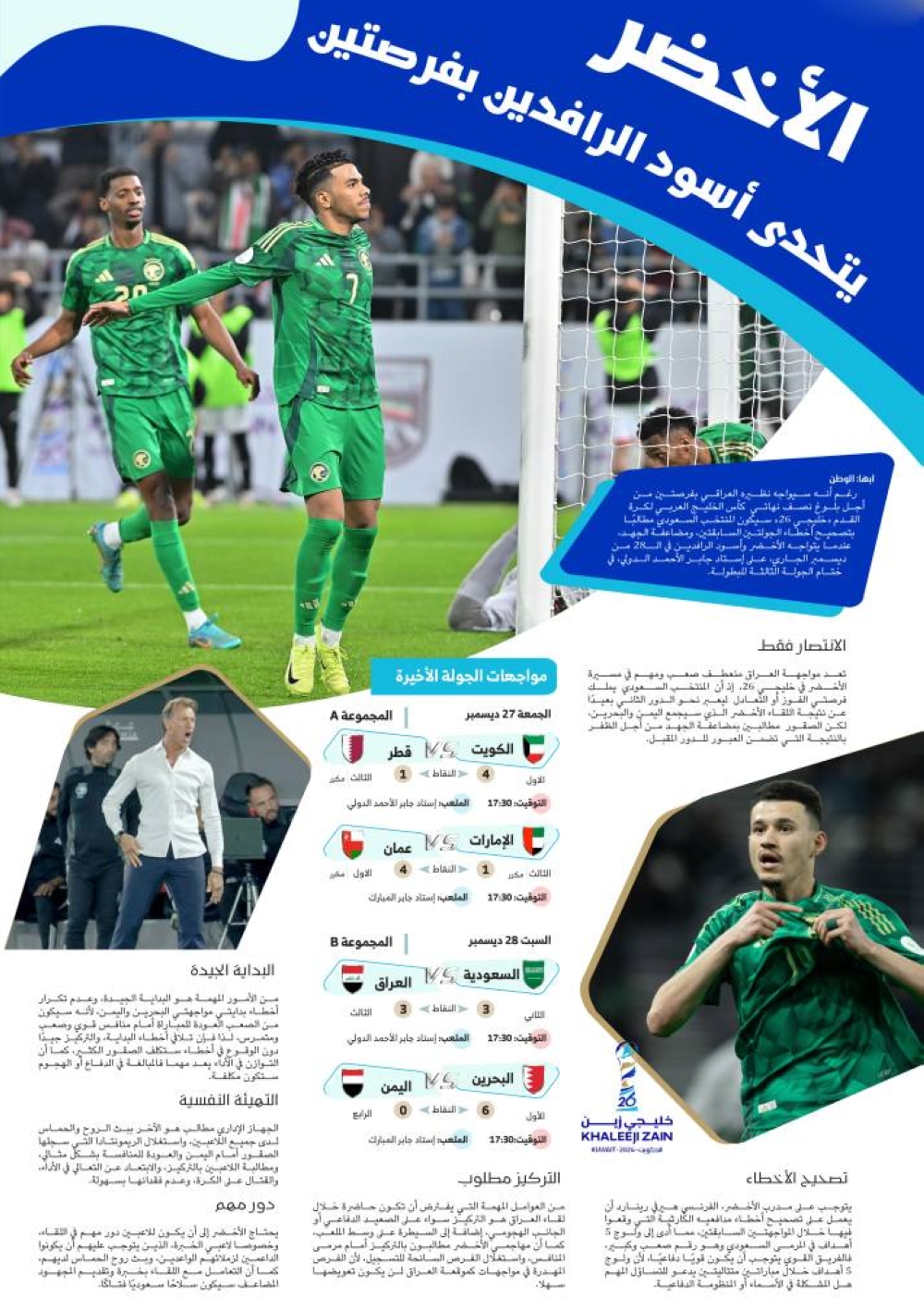 تعد مواجهة العراق منعطف صعب ومهم في مسيرة الأخضر في خليجي 26، إذ أن المنتخب السعودي يملك فرصتي الفوز أو التعادل ليعبر نحو الدور الثاني بعيدًا عن نتيجة اللقاء الأخضر الذي سيجمع اليمن والبحرين، لكن الصقور مطالبين بمضاعفة الجهد من أجل الظفر بالنتيجة التي تضمن العبور للدور المقبل.