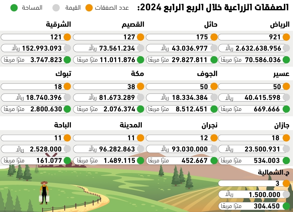 بلغ عدد الصفقات العقارية الزراعية في الربع الرابع 1575 صفقة فقط، بقيمة إجمالية بلغت 3.278.235.721 ريالاً، وبمساحة إجمالية 129.173.979 مترًا مربعًا. مقارنة بالربع الثالث، كانت الأرقام أعلى بكثير؛ حيث تم تسجيل 2794 صفقة بقيمة إجمالية 5.746.268.288 ريالًا، وبمساحة وصلت إلى 199.741.529 مترًا مربعًا.