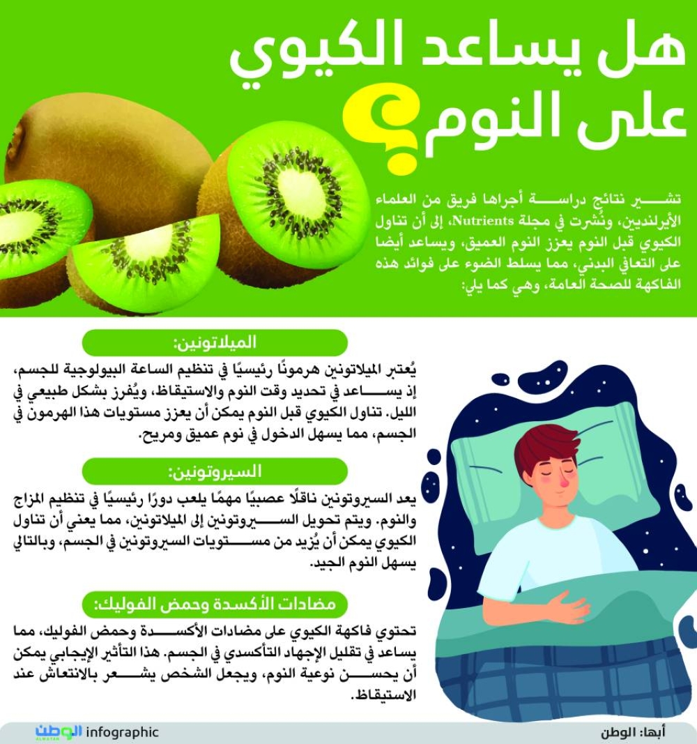 تحتوي فاكهة الكيوي على مضادات الأكسدة وحمض الفوليك، مما يساعد في تقليل الإجهاد التأكسدي في الجسم. هذا التأثير الإيجابي يمكن أن يحسن نوعية النوم، ويجعل الشخص يشعر بالانتعاش عند الاستيقاظ.