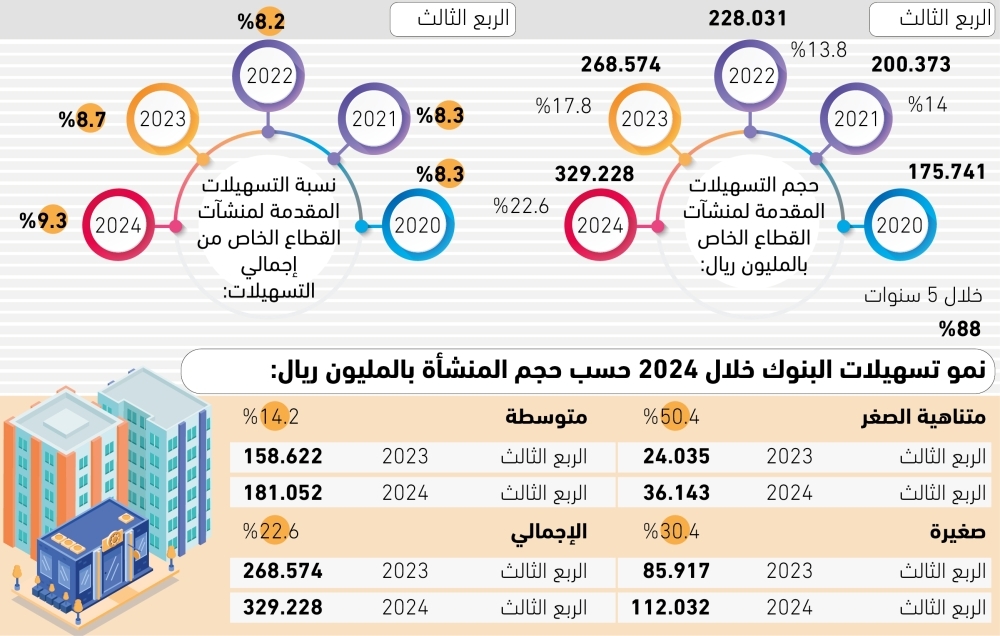 وحسب قراءة «الوطن» لبيانات البنك المركزي فقد سجلت التسهيلات المقدمة لمنشآت القطاع نموًا سنويًا مستمرًا وسريعًا، وارتفعت بنسبة 14% في 2021، لتكمل وترتفع بنسبة 13.8% في 2022، وتصل الزيادة إلى 17.8% في 2023 وتسجل في 2024 أعلى نسبة نمو 22.6%.