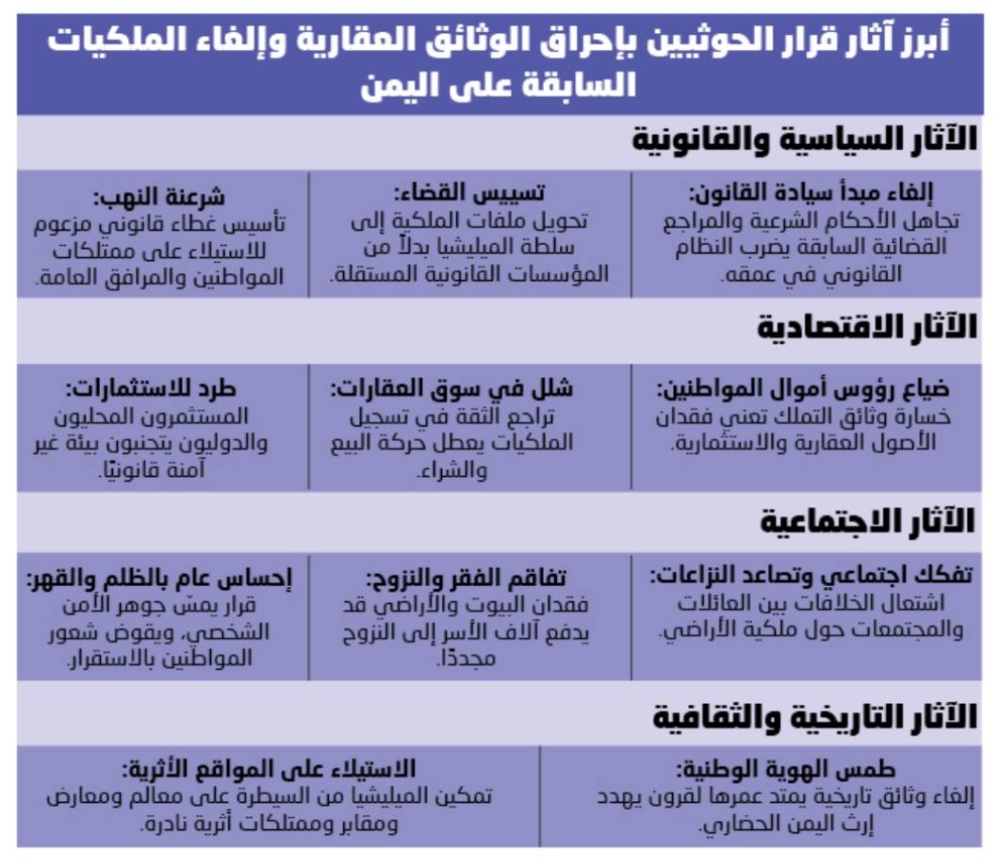وأكد المصدر أن هذه العملية جزء من خطة أوسع للسيطرة على ممتلكات اليمنيين في صنعاء والمناطق الخاضعة للحوثيين، خاصة بعد استحواذهم على مؤسسات الدولة، ونهب أملاك رجال الأعمال والتجار، مشيرًا إلى أن «الشعب اليمني يُجرّد اليوم من حقوقه في الملكية بفعل إجراءات تعسفية لا تستند إلى أي سند قانوني أو شرعي».