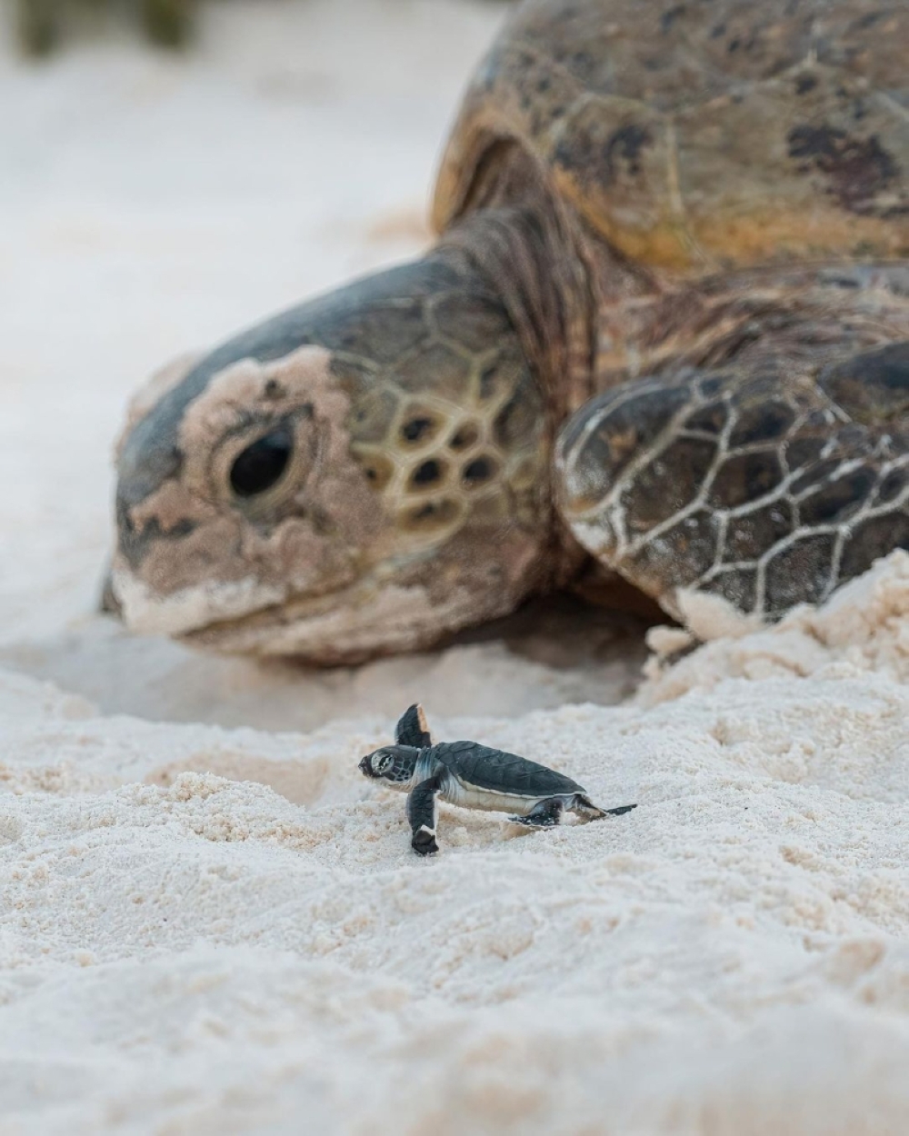 صغير سلحفاة فقس من بيضته يهرع نحو المياه، إلى جوار سلحفاة بالغة تهم بالرحيل بعد أن وضعت بيضها على ذات الشاطئ، حيث تعد المرحلة الأولى من حياة السلاحف البحرية الأشد خطورة، لمواجهة خطر الافتراس من كل جانب بلا حماية من أحد الوالدين.  ( ناشيونال جيوغرافيك)