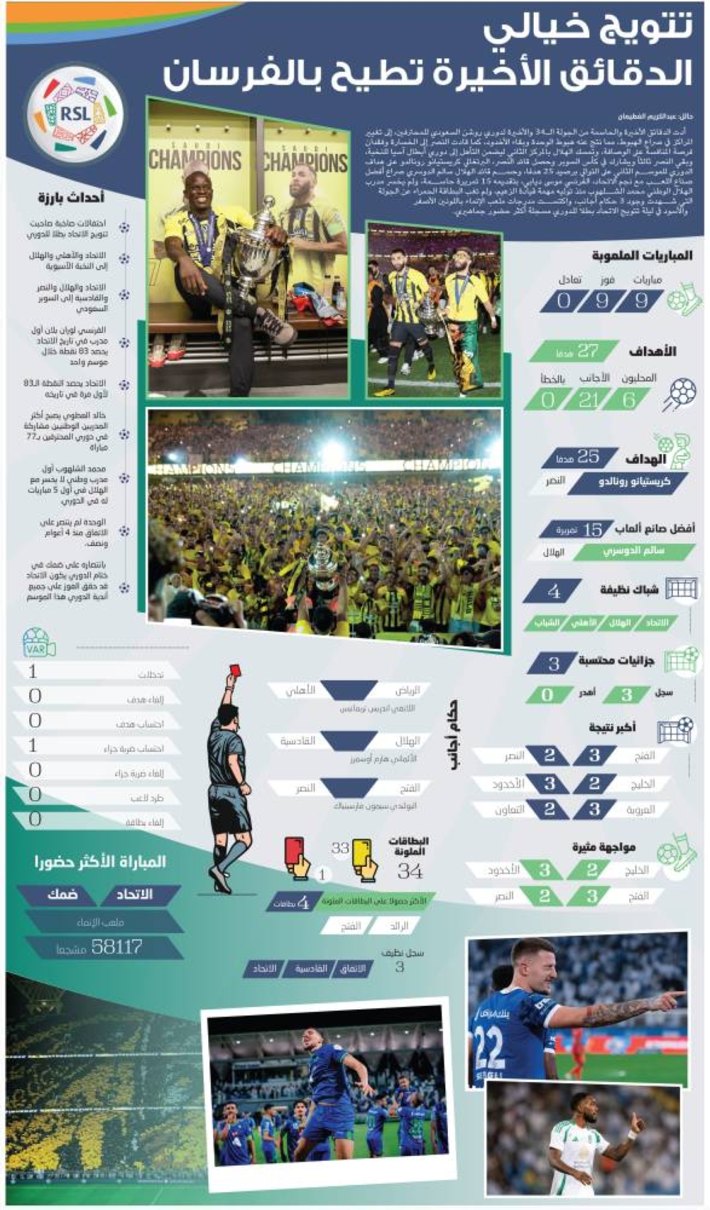 أدت الدقائق الأخيرة والحاسمة من الجولة الـ34 والأخيرة لدوري روشن السعودي للمحترفين، إلى تغيير المراكز في صراع الهبوط، مما نتج عنه هبوط الوحدة وبقاء الأخدود، كما قادت النصر إلى الخسارة وفقدان فرصة المنافسة على الوصافة، وتمسك الهلال بالمركز الثاني ليضمن التأهل إلى دوري أبطال آسيا للنخبة، وبقي النصر ثالثاً ويشارك في كأس السوبر وحصل قائد النصر، البرتغالي كريستيانو رونالدو على هداف الدوري للموسم الثاني على التوالي برصيد 25 هدفا، وحسم قائد الهلال سالم الدوسري صراع أفضل صناع اللعب مع نجم الاتحاد، الفرنسي موسى ديابي، بتقديمه 15 تمريرة حاسمة، ولم يخسر مدرب الهلال الوطني محمد الشلهوب منذ توليه مهمة قيادة الزعيم، ولم تغب البطاقة الحمراء عن الجولة التي شهدت وجود 3 حكام أجانب، واكتست مدرجات ملعب الإنماء باللونين الأصفر والأسود في ليلة تتويج الاتحاد بطلا للدوري مسجلة أكثر حضور جماهيري.