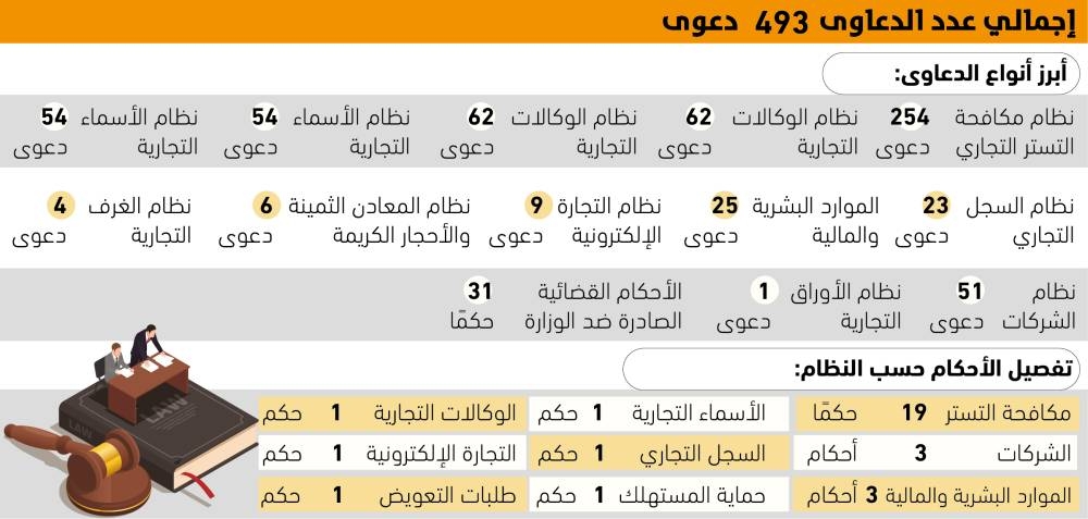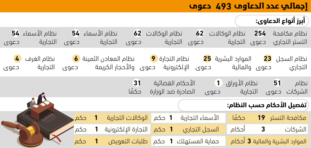 بلغ إجمالي عدد الدعاوى القضائية المقامة ضد وزارة التجارة خلال عام 2024 نحو 493 دعوى، شكّلت منها دعاوى نظام مكافحة التستر النسبة الأكبر، حيث بلغ عددها 254 دعوى، وهو ما يمثل نحو 51.5% من إجمالي القضايا المرفوعة ضد الوزارة خلال العام، وجاءت بعد ذلك دعاوى نظام الوكالات التجارية التي بلغ عددها 62 دعوى، تلتها دعاوى نظام الأسماء التجارية بـ54 دعوى، فيما بلغت دعاوى نظام الشركات 51 دعوى. أما بقية القضايا فقد توزعت بين عدد من الأنظمة، إذ سُجلت 23 دعوى تتعلق بنظام السجل التجاري، و25 دعوى مرتبطة بقطاع الموارد البشرية والمالية، إلى جانب 9 دعاوى تتعلق بنظام التجارة الإلكترونية، و6 دعاوى ضمن نظام المعادن الثمينة والأحجار الكريمة، و4 دعاوى في إطار نظام الغرف التجارية، فيما سجلت دعوى واحدة فقط بموجب نظام الأوراق التجارية.