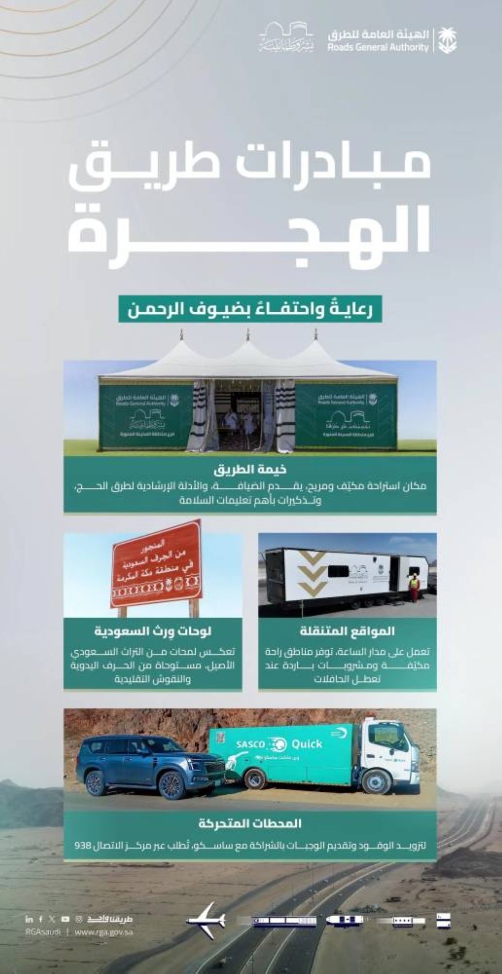 وسعت "هيئة الطرق"، بالتعاون مع الشركة السعودية لخدمات السيارات (ساسكو)، إلى توفير محطات وقود متنقلة على طريق الهجرة، بهدف تعزيز الشراكة مع القطاع الخاص وتقديم خدمات متميزة، تتيح دعمًا فوريًا لحالات الطوارئ عبر مركز الاتصال (938)، مما يسهم في تحسين جودة الخدمات ورفع مستوى السلامة المرورية.
