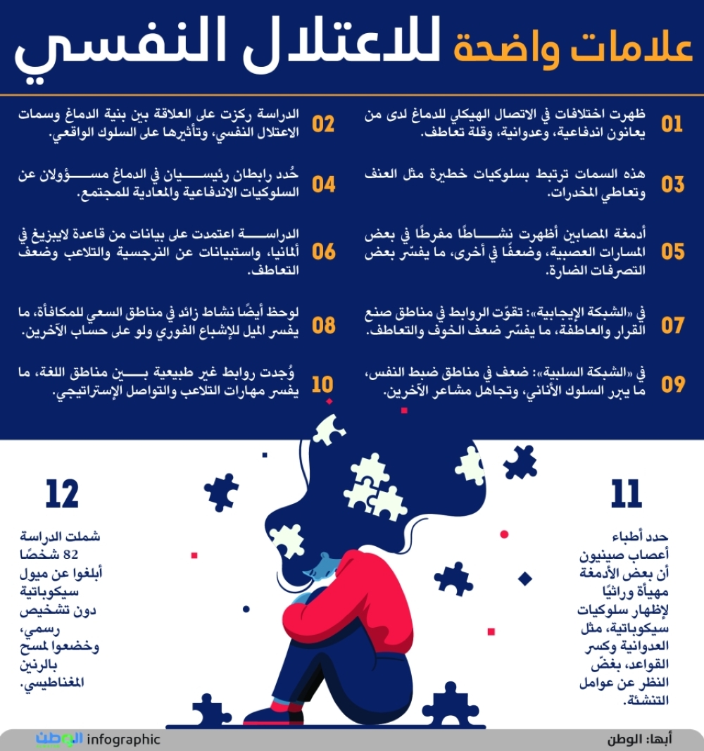 • أدمغة المصابين أظهرت نشاطًا مفرطًا في بعض المسارات العصبية، وضعفًا في أخرى، ما يفسّر بعض التصرفات الضارة.