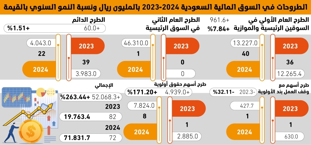 وشكل الطرح العام الأولي (في السوقين الرئيسية والموازية) ركيزة أساسية لهذا النمو، حيث صعدت قيمته من 12.3 مليار ريال في 2023 إلى 13.2 مليار ريال في 2024، بزيادة قدرها 7.8% رغم ارتفاع عدد الطروحات من 36 إلى 40 فقط.