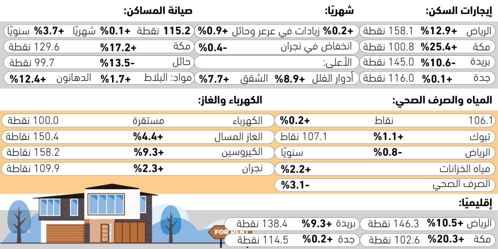 قاد بند إيجارات السكن هذا الارتفاع بعد أن ارتفع بنسبة 6.6% على أساس سنوي ليصل إلى 113.7 نقطة. وتصدرت الرياض الزيادة بنسبة 12.9% لتسجل 158.1 نقطة، بينما شهدت مكة قفزة لافتة بنسبة 25.4% لتبلغ 100.8 نقطة. في المقابل، تراجعت الإيجارات في بريدة بنسبة 10.6% لتسجل 145.0 نقطة، في حين اكتفت جدة بزيادة طفيفة بلغت 0.1% عند 116 نقطة. وعلى المستوى الشهري، ارتفعت الإيجارات بنسبة 0.2%، وسجلت عرعر وحائل أبرز الزيادات بواقع 0.9% لكل منهما، بينما انخفضت الإيجارات في نجران بنسبة 0.4%.