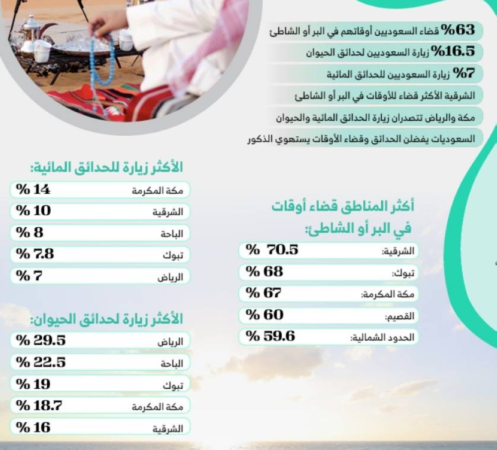 سيطر قضاء الأوقات في البر والشواطئ على اهتمامات السعوديين خلال العام الماضي، حيث أظهر 63.4% منهم تفضيلهم لهذه الوجهات. وتقدمت المنطقة الشرقية لتسجل أعلى نسبة من رواد البر بواقع 70.5%. وفي المقابل، بلغت نسبة زيارة حدائق الحيوان 16.5% فقط، بينما لم تتجاوز نسبة السعوديين الذين قصدوا الحدائق المائية 7%.