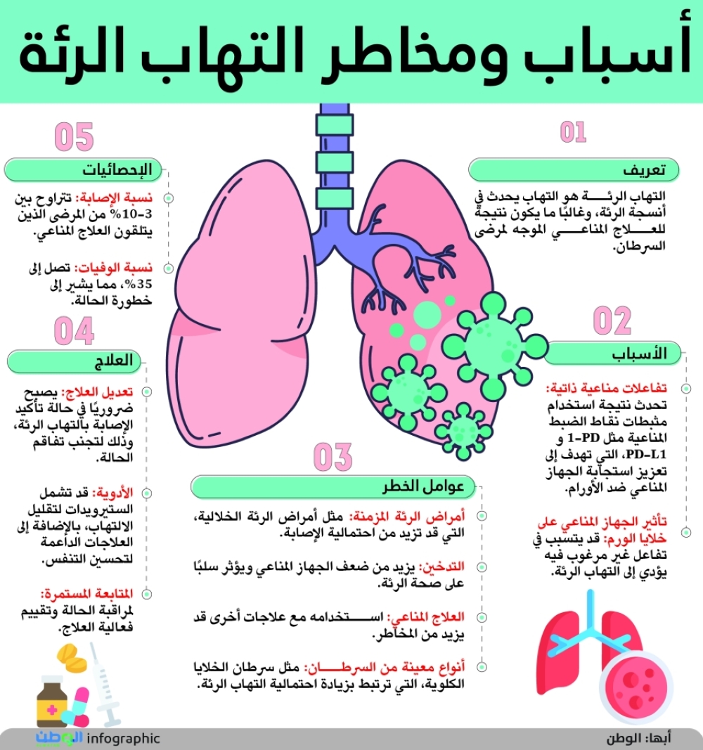 - تأثير الجهاز المناعي على خلايا الورم: قد يتسبب في تفاعل غير مرغوب فيه يؤدي إلى التهاب الرئة.