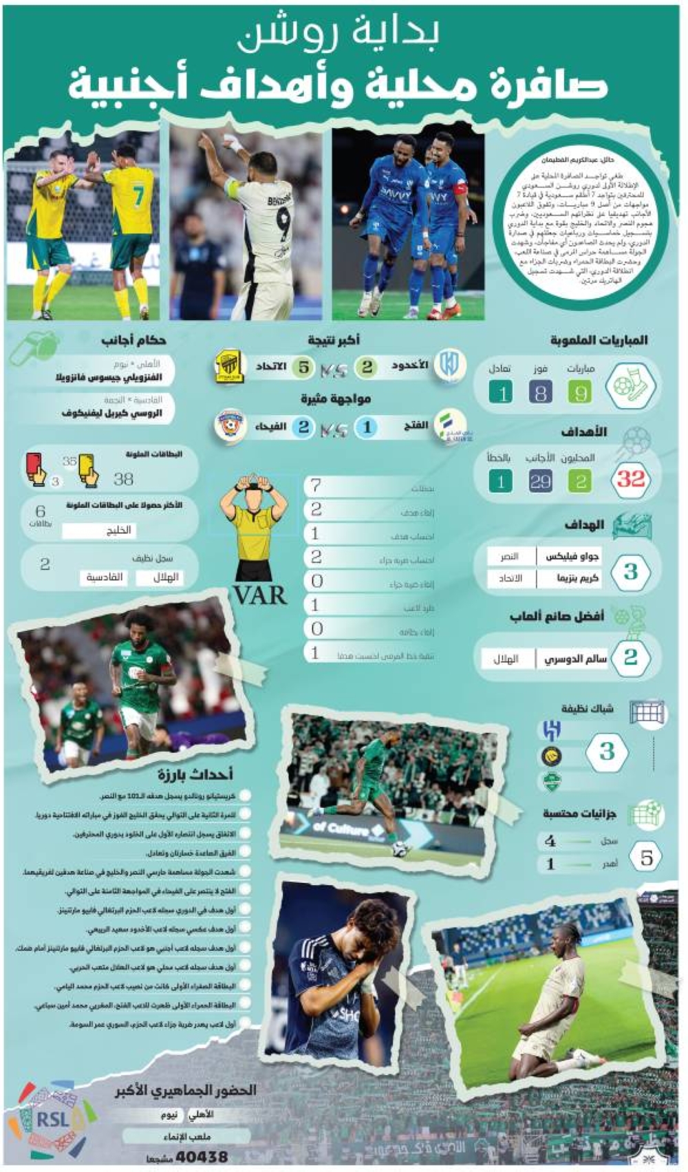 طغى تواجد الصافرة المحلية على الإطلالة الأولى لدوري روشن السعودي للمحترفين بتواجد 7 أطقم سعودية في قيادة 7 مواجهات من أصل 9 مباريات، وتفوق اللاعبون الأجانب تهديفيا على نظرائهم السعوديين، وضرب هجوم النصر والاتحاد والخليج بقوة مع بداية الدوري بتسجيل خماسيات ورباعيات جعلتهم في صدارة الدوري، ولم يحدث الصاعدون أي مفاجآت، وشهدت الجولة مساهمة حراس المرمى في صناعة اللعب، وحضرت البطاقة الحمراء وضربات الجزاء مع انطلاقة الدوري، التي شهدت تسجيل الهاتريك مرتين.
