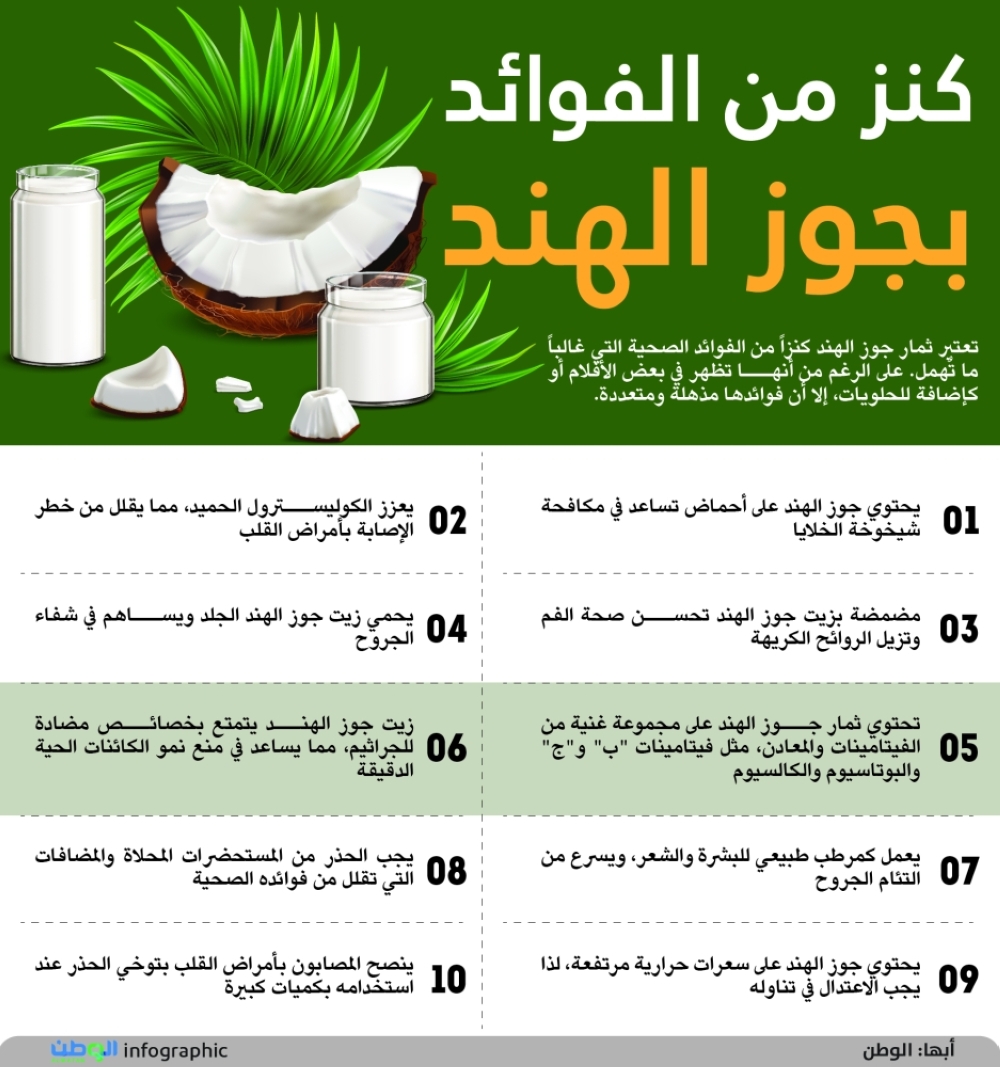 - يحتوي جوز الهند على سعرات حرارية مرتفعة، لذا يجب الاعتدال في تناوله.