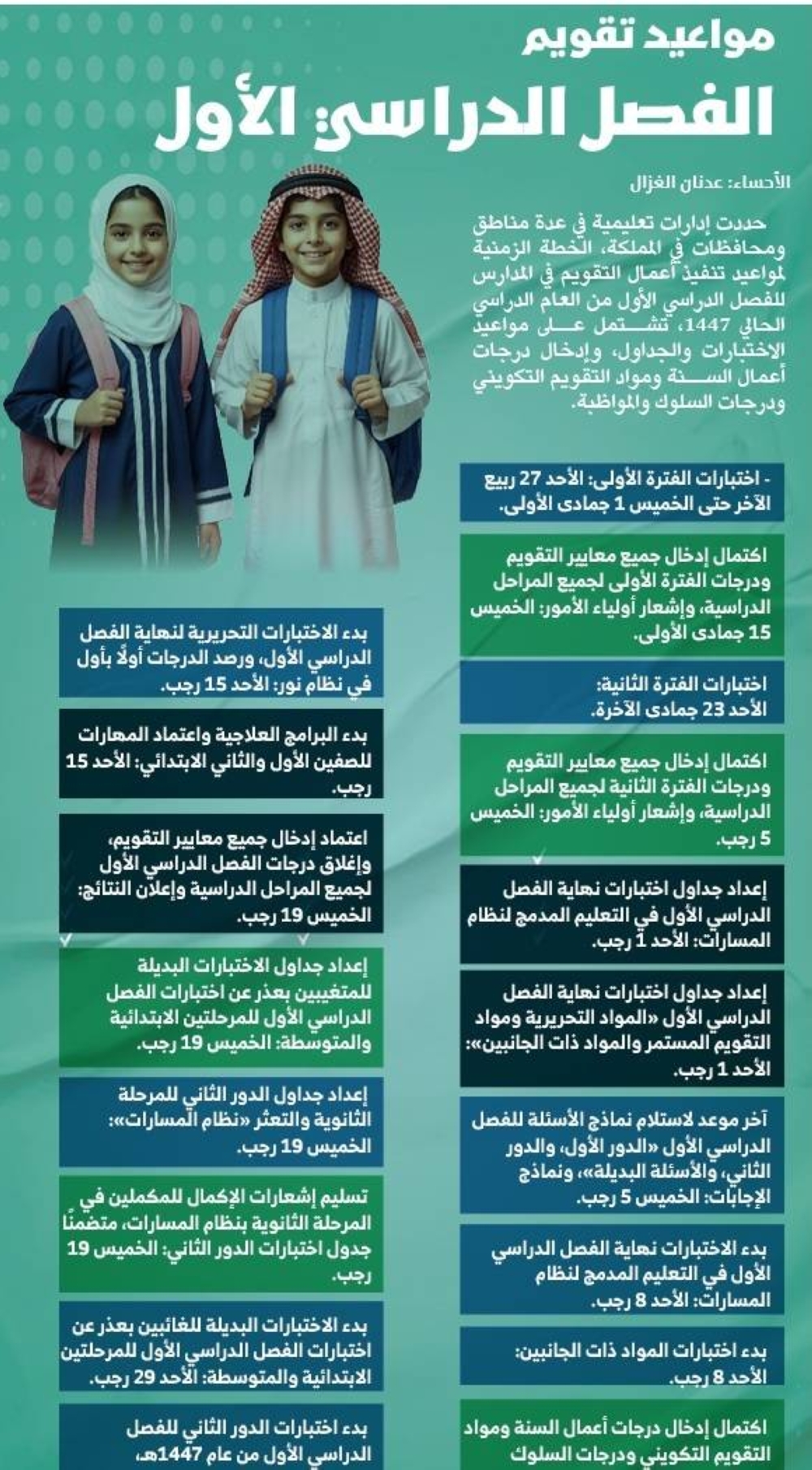 حددت إدارات تعليمية في عدة مناطق ومحافظات في المملكة، الخطة الزمنية لمواعيد تنفيذ أعمال التقويم في المدارس للفصل الدراسي الأول من العام الدراسي الحالي 1447، تشتمل على مواعيد الاختبارات والجداول، وإدخال درجات أعمال السنة ومواد التقويم التكويني ودرجات السلوك والمواظبة.