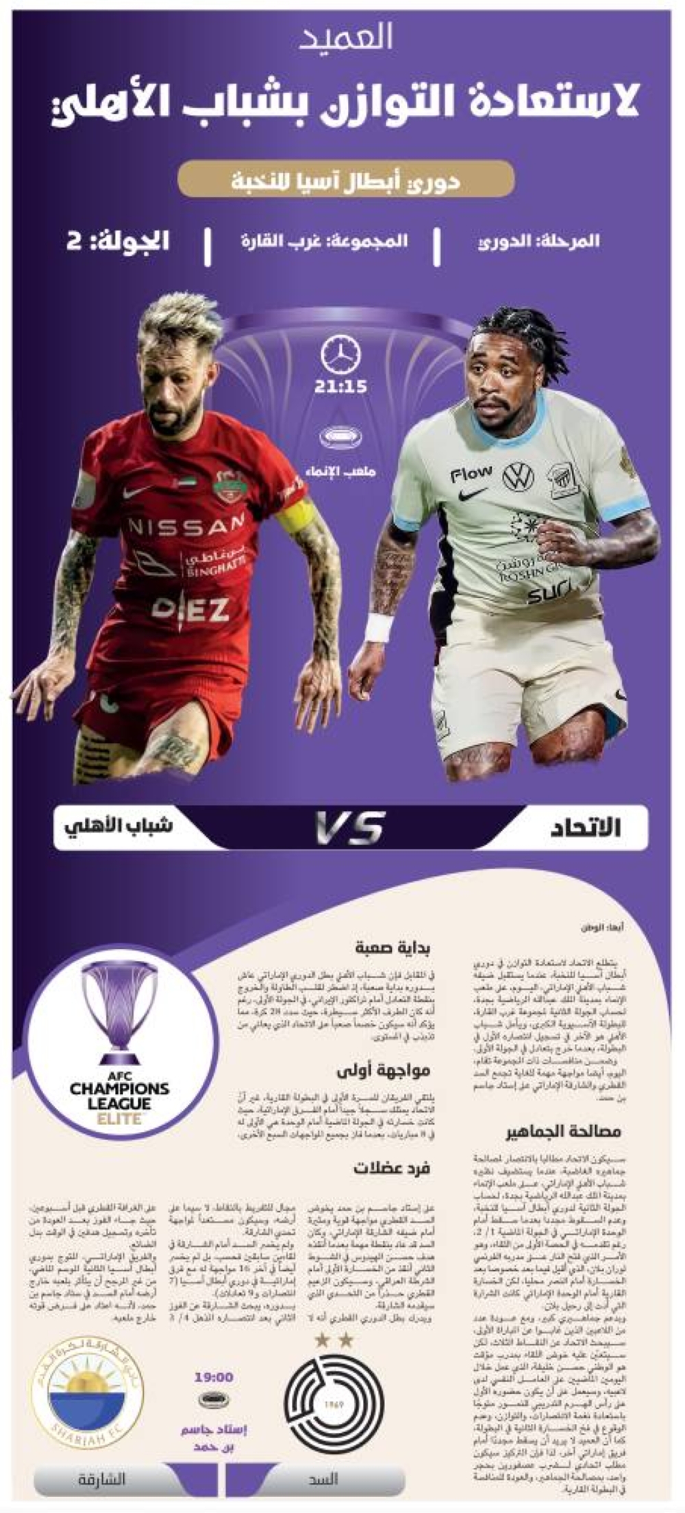 سيكون الاتحاد مطالبا بالانتصار لمصالحة جماهيره الغاضبة، عندما يستضيف نظيره شباب الأهلي الإماراتي، على ملعب الإنماء بمدينة الملك عبدالله الرياضية بجدة، لحساب الجولة الثانية لدوري أبطال آسيا للنخبة، وعدم السقوط مجددا بعدما سقط أمام الوحدة الإماراتي في الجولة الماضية 1/ 2، رغم تقدمه في الحصة الأولى من اللقاء، وهو الأمر الذي فتح النار على مدربه الفرنسي لوران بلان، الذي أقيل فيما بعد خصوصا بعد الخسارة أمام النصر محليا، لكن الخسارة القارية أمام الوحدة الإماراتي كانت الشرارة التي أدت إلى رحيل بلان.